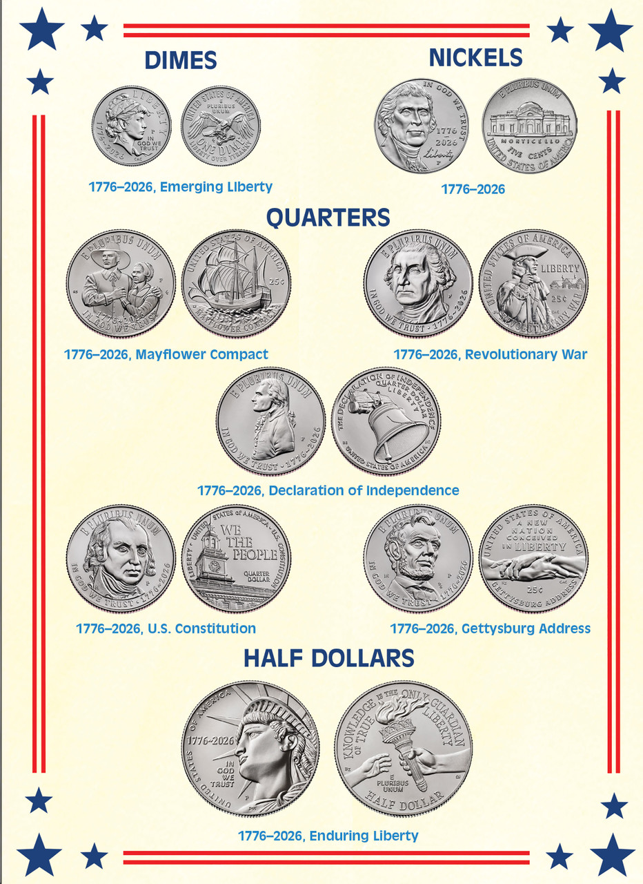 To celebrate the nation's 250th birthday (semiquincentennial) in 2026, the United States Mint unveiled one-year-only changes to American circulating dime, quarter, and half dollar and utilized the dual 1776-2026 date on a wide range of coinage. Wizard offers a variety of products to celebrate the nation's semiquincentennial by saving these circulating commemorative coins.