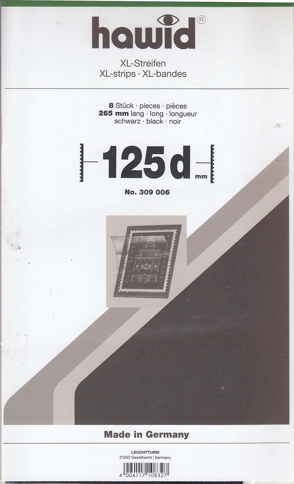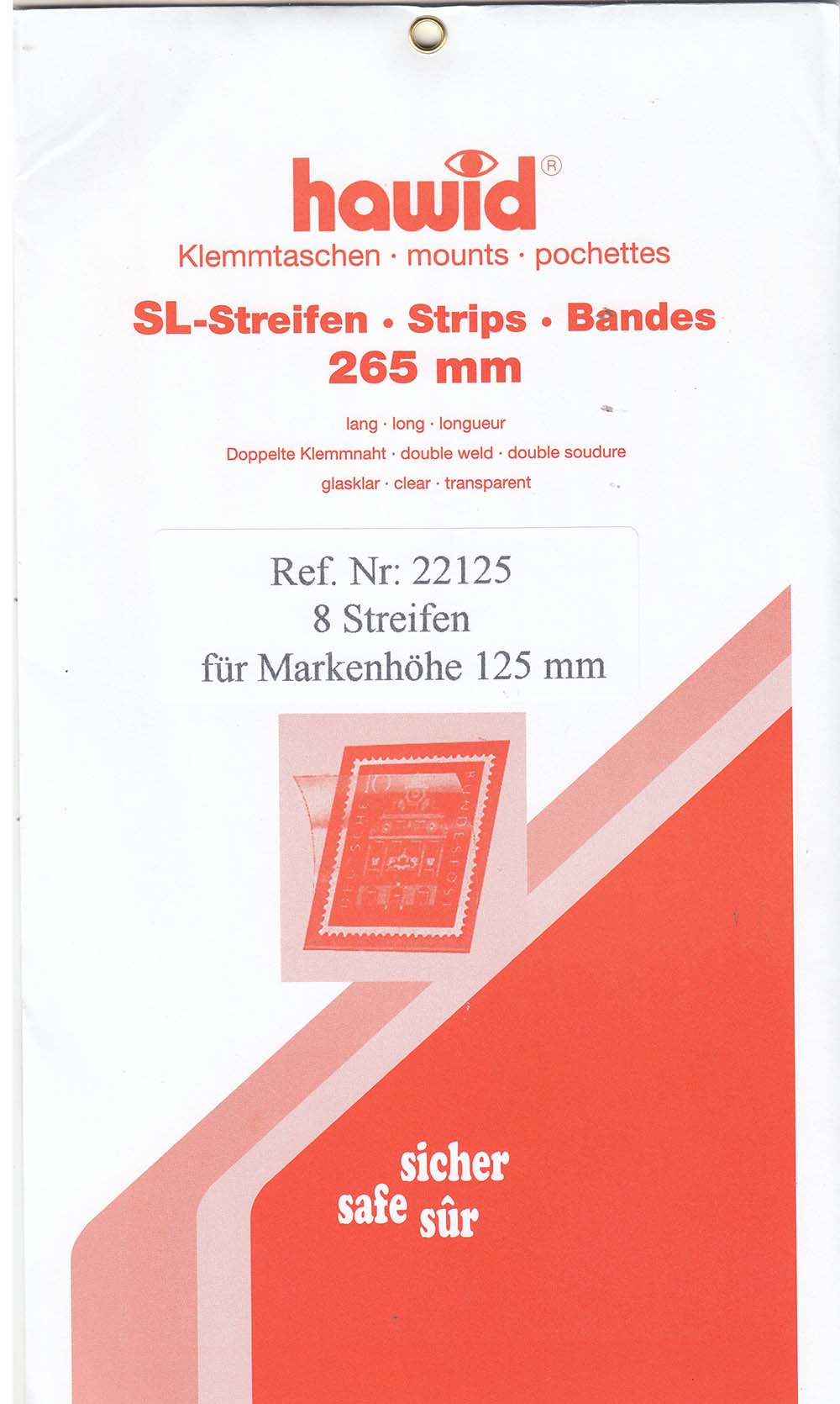 Philatelists around the world protect their valuable stamps with Hawid Stamp Mounts. Hawid Stamp Mounts provide lasting protection and optimum flexibility for configuration of one's stamp collection. The thin and extremely stable Hawid Stamp Mount consists of a rubberized back and a clear covering film. The rubberized backs are available in either black or clear to provide an aesthetic frame for your stamps' perforations and designs. The clear cover holds the stamp in place with spring action while a curvature allows for breathing. The two pieces are precisely joined at the bottom for exact positioning of the stamp (mounts 70mm or more in height are also joined at the top). The rubberized backs on Hawid Stamp Mounts have an adhesive coating that, when slightly moistened, allows for the securing of the stamp mount in place. These mount strips are 265 mm long and can be cut to the desired length. Hawid Stamp Mounts are made from archival, plasticizer-free polystyrene.