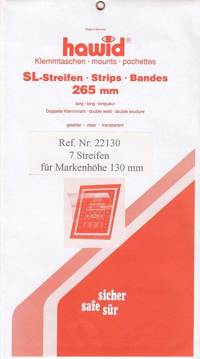 Philatelists around the world protect their valuable stamps with Hawid Stamp Mounts. Hawid Stamp Mounts provide lasting protection and optimum flexibility for configuration of the one’s stamp collection. The thin and extremely stable Hawid Stamp Mount consists of a rubberized back and a clear covering film. The rubberized backs are available in either black or clear to provide an aesthetic frame for your stamps’ perforations and designs. The clear cover holds the stamp in place with spring action while a curvature allows for breathing. The two pieces are precisely joined at the bottom for exact positioning of the stamp (mounts 70mm or more in height are also joined at the top). The rubberized backs on Hawid Stamp Mounts have an adhesive coating that, when slightly moistened, allows for the securing of the stamp mount in place. These mount strips are 265mm long and can be cut to the desired length. Hawid Stamp Mounts are made from archival, plasticizer-free polystyrene.