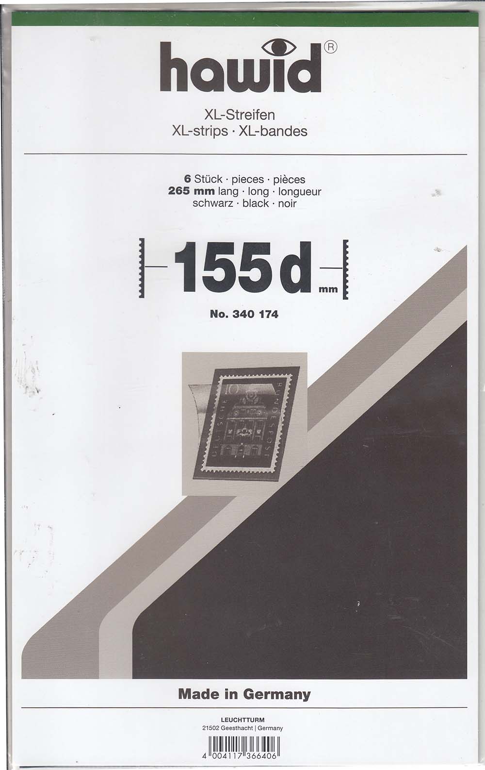 Philatelists around the world protect their valuable stamps with Hawid Stamp Mounts. Hawid Stamp Mounts provide lasting protection and optimum flexibility for configuration of one's stamp collection. The thin and extremely stable Hawid Stamp Mount consists of a rubberized back and a clear covering film. The rubberized backs are available in either black or clear to provide an aesthetic frame for your stamps' perforations and designs. The clear cover holds the stamp in place with spring action while a curvature allows for breathing. The two pieces are precisely joined at the bottom for exact positioning of the stamp (mounts 70mm or more in height are also joined at the top). The rubberized backs on Hawid Stamp Mounts have an adhesive coating that, when slightly moistened, allows for the securing of the stamp mount in place. These mount strips are 265 mm long and can be cut to the desired length. Hawid Stamp Mounts are made from archival, plasticizer-free polystyrene.