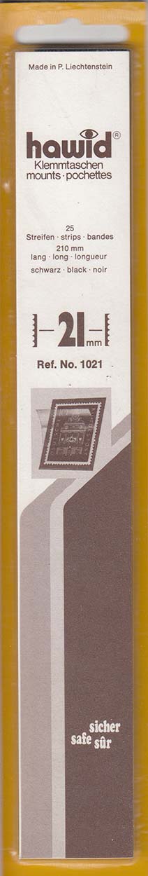 Philatelists around the world protect their valuable stamps with Hawid Stamp Mounts. Hawid Stamp Mounts provide lasting protection and optimum flexibility for configuration of the one’s stamp collection. The thin and extremely stable Hawid Stamp Mount consists of a rubberized back and a clear covering film. The rubberized backs are available in either black or clear to provide an aesthetic frame for your stamps’ perforations and designs. The clear cover holds the stamp in place with spring action while a curvature allows for breathing. The two pieces are precisely joined at the bottom for exact positioning of the stamp (mounts 70mm or more in height are also joined at the top). The rubberized backs on Hawid Stamp Mounts have an adhesive coating that, when slightly moistened, allows for the securing of the stamp mount in place. These mount strips are 210mm long and can be cut to the desired length. Hawid Stamp Mounts are made from archival, plasticizer-free polystyrene.