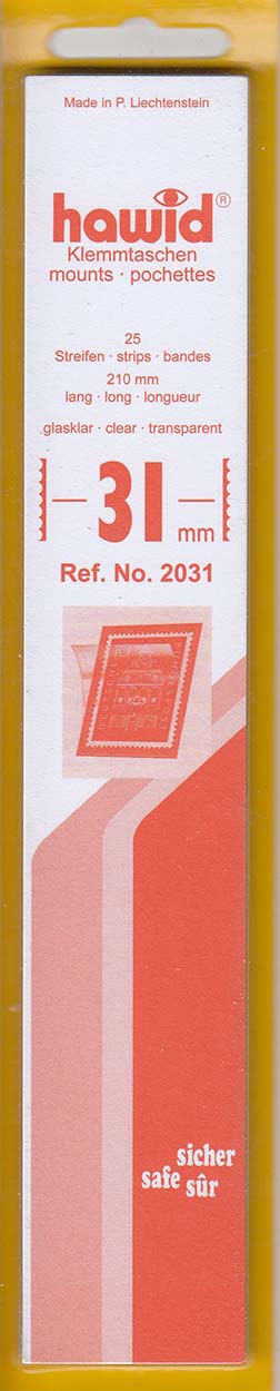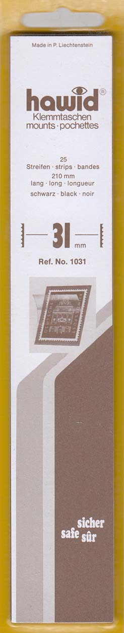 Philatelists around the world protect their valuable stamps with Hawid Stamp Mounts. Hawid Stamp Mounts provide lasting protection and optimum flexibility for configuration of the one’s stamp collection. The thin and extremely stable Hawid Stamp Mount consists of a rubberized back and a clear covering film. The rubberized backs are available in either black or clear to provide an aesthetic frame for your stamps’ perforations and designs. The clear cover holds the stamp in place with spring action while a curvature allows for breathing. The two pieces are precisely joined at the bottom for exact positioning of the stamp (mounts 70mm or more in height are also joined at the top). The rubberized backs on Hawid Stamp Mounts have an adhesive coating that, when slightly moistened, allows for the securing of the stamp mount in place. These mount strips are 210mm long and can be cut to the desired length. Hawid Stamp Mounts are made from archival, plasticizer-free polystyrene.