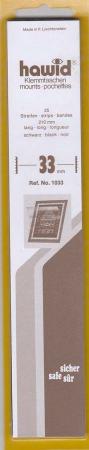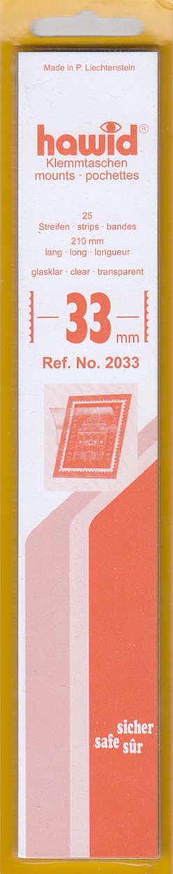 Philatelists around the world protect their valuable stamps with Hawid Stamp Mounts. Hawid Stamp Mounts provide lasting protection and optimum flexibility for configuration of the one’s stamp collection. The thin and extremely stable Hawid Stamp Mount consists of a rubberized back and a clear covering film. The rubberized backs are available in either black or clear to provide an aesthetic frame for your stamps’ perforations and designs. The clear cover holds the stamp in place with spring action while a curvature allows for breathing. The two pieces are precisely joined at the bottom for exact positioning of the stamp (mounts 70mm or more in height are also joined at the top). The rubberized backs on Hawid Stamp Mounts have an adhesive coating that, when slightly moistened, allows for the securing of the stamp mount in place. These mount strips are 210mm long and can be cut to the desired length. Hawid Stamp Mounts are made from archival, plasticizer-free polystyrene.