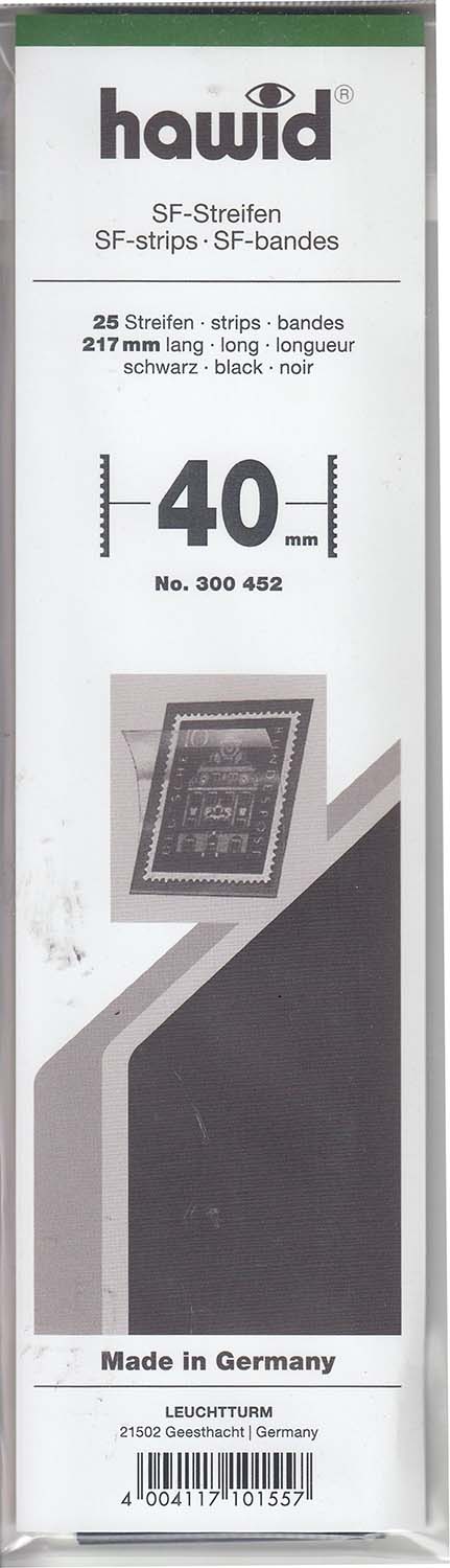 Philatelists around the world protect their valuable stamps with Hawid Stamp Mounts. Hawid Stamp Mounts provide lasting protection and optimum flexibility for configuration of one's stamp collection. The thin and extremely stable Hawid Stamp Mount consists of a rubberized back and a clear covering film. The rubberized backs are available in either black or clear to provide an aesthetic frame for your stamps' perforations and designs. The clear cover holds the stamp in place with spring action while a curvature allows for breathing. The two pieces are precisely joined at the bottom for exact positioning of the stamp (mounts 70mm or more in height are also joined at the top). The rubberized backs on Hawid Stamp Mounts have an adhesive coating that, when slightly moistened, allows for the securing of the stamp mount in place. These mount strips are 217 mm long and can be cut to the desired length. Hawid Stamp Mounts are made from archival, plasticizer-free polystyrene.