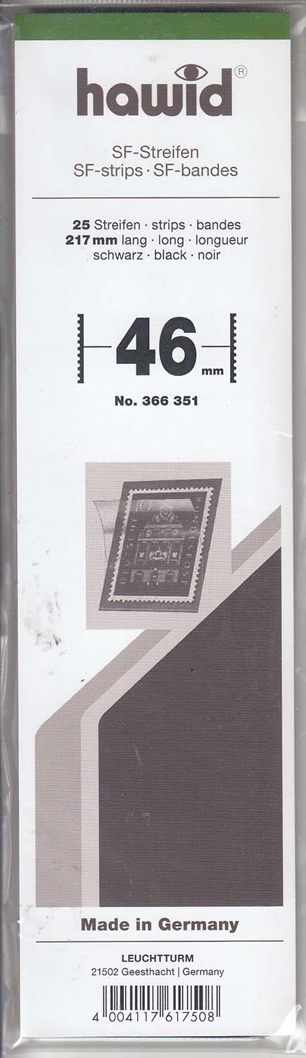 Philatelists around the world protect their valuable stamps with Hawid Stamp Mounts. Hawid Stamp Mounts provide lasting protection and optimum flexibility for configuration of one's stamp collection. The thin and extremely stable Hawid Stamp Mount consists of a rubberized back and a clear covering film. The rubberized backs are available in either black or clear to provide an aesthetic frame for your stamps' perforations and designs. The clear cover holds the stamp in place with spring action while a curvature allows for breathing. The two pieces are precisely joined at the bottom for exact positioning of the stamp (mounts 70mm or more in height are also joined at the top). The rubberized backs on Hawid Stamp Mounts have an adhesive coating that, when slightly moistened, allows for the securing of the stamp mount in place. These mount strips are 217 mm long and can be cut to the desired length. Hawid Stamp Mounts are made from archival, plasticizer-free polystyrene.