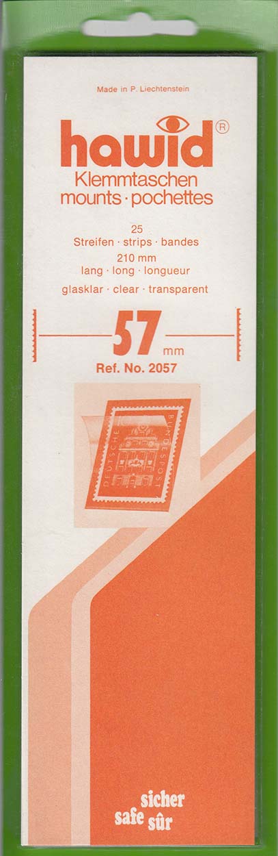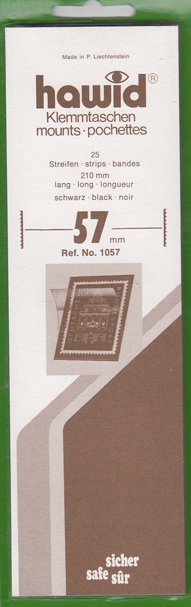 Philatelists around the world protect their valuable stamps with Hawid Stamp Mounts. Hawid Stamp Mounts provide lasting protection and optimum flexibility for configuration of the one’s stamp collection. The thin and extremely stable Hawid Stamp Mount consists of a rubberized back and a clear covering film. The rubberized backs are available in either black or clear to provide an aesthetic frame for your stamps’ perforations and designs. The clear cover holds the stamp in place with spring action while a curvature allows for breathing. The two pieces are precisely joined at the bottom for exact positioning of the stamp (mounts 70mm or more in height are also joined at the top). The rubberized backs on Hawid Stamp Mounts have an adhesive coating that, when slightly moistened, allows for the securing of the stamp mount in place. These mount strips are 210mm long and can be cut to the desired length. Hawid Stamp Mounts are made from archival, plasticizer-free polystyrene.