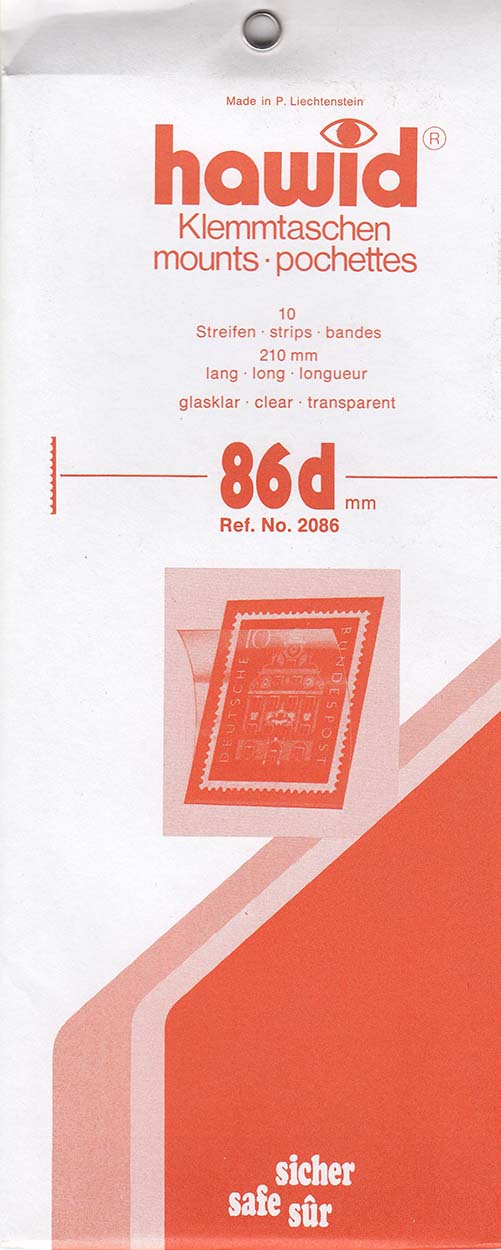 Philatelists around the world protect their valuable stamps with Hawid Stamp Mounts. Hawid Stamp Mounts provide lasting protection and optimum flexibility for configuration of the one’s stamp collection. The thin and extremely stable Hawid Stamp Mount consists of a rubberized back and a clear covering film. The rubberized backs are available in either black or clear to provide an aesthetic frame for your stamps’ perforations and designs. The clear cover holds the stamp in place with spring action while a curvature allows for breathing. The two pieces are precisely joined at the bottom for exact positioning of the stamp (mounts 70mm or more in height are also joined at the top). The rubberized backs on Hawid Stamp Mounts have an adhesive coating that, when slightly moistened, allows for the securing of the stamp mount in place. These mount strips are 210mm long and can be cut to the desired length. Hawid Stamp Mounts are made from archival, plasticizer-free polystyrene.