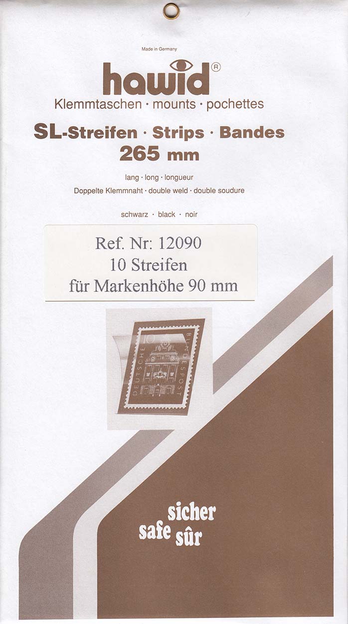 Philatelists around the world protect their valuable stamps with Hawid Stamp Mounts. Hawid Stamp Mounts provide lasting protection and optimum flexibility for configuration of the one’s stamp collection. The thin and extremely stable Hawid Stamp Mount consists of a rubberized back and a clear covering film. The rubberized backs are available in either black or clear to provide an aesthetic frame for your stamps’ perforations and designs. The clear cover holds the stamp in place with spring action while a curvature allows for breathing. The two pieces are precisely joined at the bottom for exact positioning of the stamp (mounts 70mm or more in height are also joined at the top). The rubberized backs on Hawid Stamp Mounts have an adhesive coating that, when slightly moistened, allows for the securing of the stamp mount in place. These mount strips are 265mm long and can be cut to the desired length. Hawid Stamp Mounts are made from archival, plasticizer-free polystyrene.