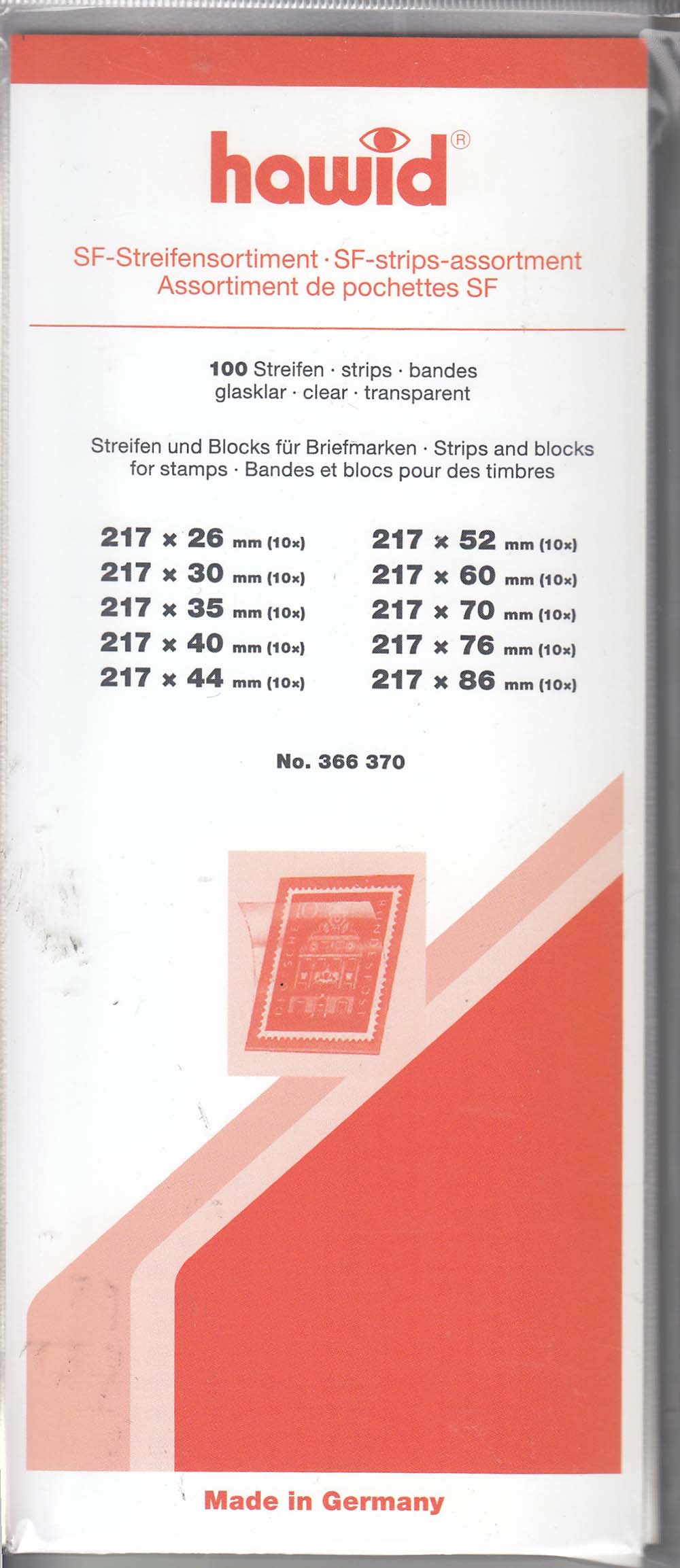 Philatelists around the world protect their valuable stamps with Hawid Stamp Mounts. Hawid Stamp Mounts provide lasting protection and optimum flexibility for configuration of one's stamp collection. The thin and extremely stable Hawid Stamp Mount consists of a rubberized back and a clear covering film. The rubberized backs are available in either black or clear to provide an aesthetic frame for your stamps' perforations and designs. The clear cover holds the stamp in place with spring action while a curvature allows for breathing. The two pieces are precisely joined at the bottom for exact positioning of the stamp (mounts 70mm or more in height are also joined at the top). The rubberized backs on Hawid Stamp Mounts have an adhesive coating that, when slightly moistened, allows for the securing of the stamp mount in place. The mount strips in this pack range in height from 26mm to 86mm and they are 217mm long and can be cut to the desired length.Hawid Stamp Mounts are made from archival, plasticizer-free polystyrene.