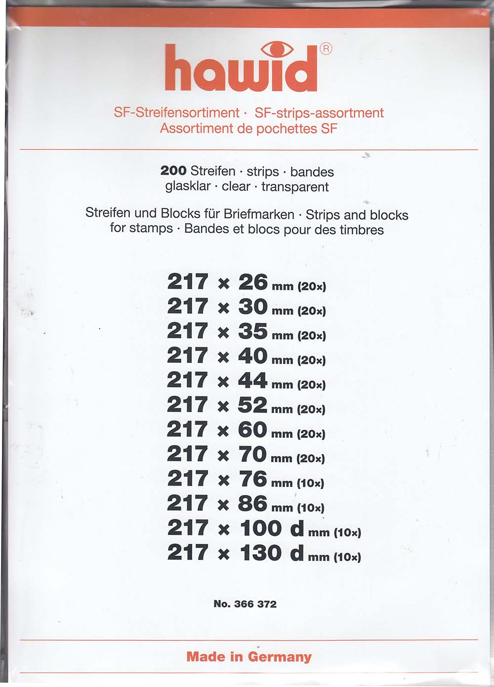 Philatelists around the world protect their valuable stamps with Hawid Stamp Mounts. Hawid Stamp Mounts provide lasting protection and optimum flexibility for configuration of one's stamp collection. The thin and extremely stable Hawid Stamp Mount consists of a rubberized back and a clear covering film. The rubberized backs are available in either black or clear to provide an aesthetic frame for your stamps' perforations and designs. The clear cover holds the stamp in place with spring action while a curvature allows for breathing. The two pieces are precisely joined at the bottom for exact positioning of the stamp (mounts 70mm or more in height are also joined at the top). The rubberized backs on Hawid Stamp Mounts have an adhesive coating that, when slightly moistened, allows for the securing of the stamp mount in place. The mount strips in this pack range in height from 26mm to 130mm and they are 217mm long and can be cut to the desired length.Hawid Stamp Mounts are made from archival, plasticizer-free polystyrene.