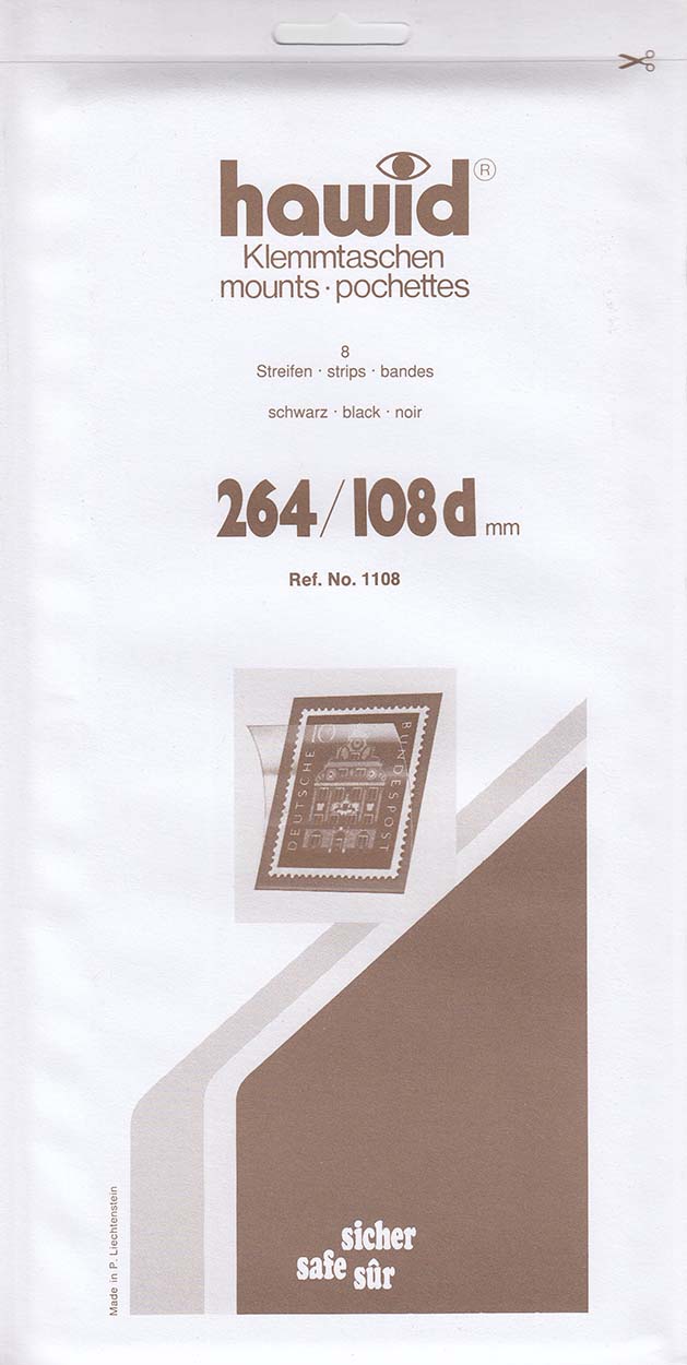Philatelists around the world protect their valuable stamps with Hawid Stamp Mounts. Hawid Stamp Mounts provide lasting protection and optimum flexibility for configuration of the one’s stamp collection. The thin and extremely stable Hawid Stamp Mount consists of a rubberized back and a clear covering film. The rubberized backs are available in either black or clear to provide an aesthetic frame for your stamps’ perforations and designs. The clear cover holds the stamp in place with spring action while a curvature allows for breathing. The two pieces are precisely joined at the bottom for exact positioning of the stamp (mounts 70mm or more in height are also joined at the top). The rubberized backs on Hawid Stamp Mounts have an adhesive coating that, when slightly moistened, allows for the securing of the stamp mount in place. Hawid Stamp Mounts are made from archival, plasticizer-free polystyrene.