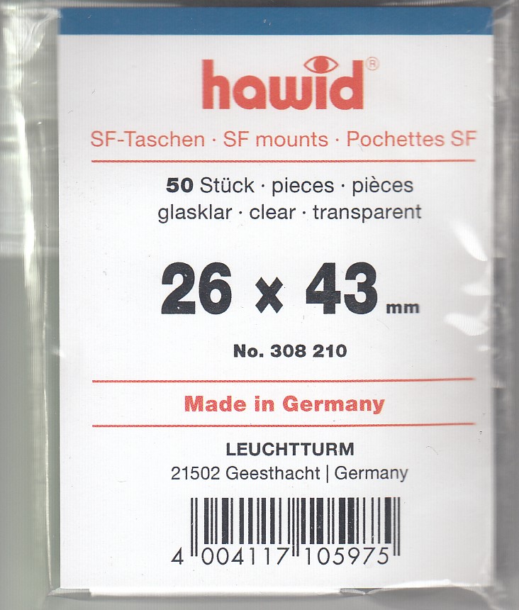 Philatelists around the world protect their valuable stamps with Hawid Stamp Mounts. Hawid Stamp Mounts provide lasting protection and optimum flexibility for configuration of the one’s stamp collection. The thin and extremely stable Hawid Stamp Mount consists of a rubberized back and a clear covering film. The rubberized backs are available in either black or clear to provide an aesthetic frame for your stamps’ perforations and designs. The clear cover holds the stamp in place with spring action while a curvature allows for breathing. The two pieces are precisely joined at the bottom for exact positioning of the stamp (mounts 70mm or more in height are also joined at the top). The rubberized backs on Hawid Stamp Mounts have an adhesive coating that, when slightly moistened, allows for the securing of the stamp mount in place. Hawid Stamp Mounts are made from archival, plasticizer-free polystyrene.