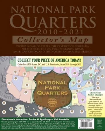 Display your quarter collection in this educational Collector Map. Openings for all 56 National Park Quarters. Big 13" x 16.5" Acid Free Archival Safe Board construction is inert and safe for your coins. The National Park Quarters Coin Act of 2008 requires quarters, beginning in 2010, to have designs on the reverse depecting one national site in each state, the District of Columbia and territory of the United States. 56 Different designs will complete the program from 2010 through 2021. For a matching map for your State Quarters, get the HE Harris State Series Quarters Collectors Map
