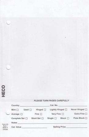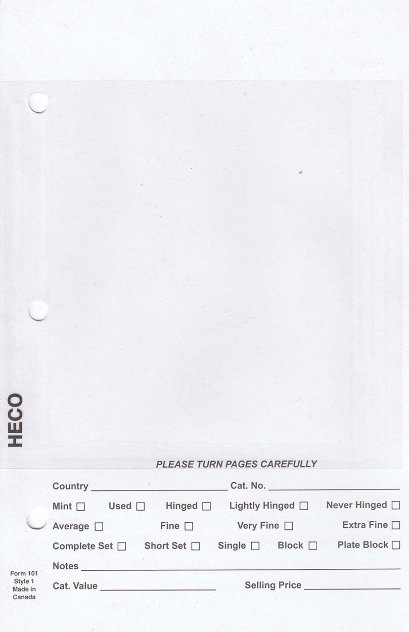 HECO Dealer Sales Pages are made with clear windows that stays firmly affixed to the page. This model features a full size window on a white background. Below the window is an area for noting country, catalog number, condition, catalog price, dealer price and other information. Sold in boxes of 500 pages.