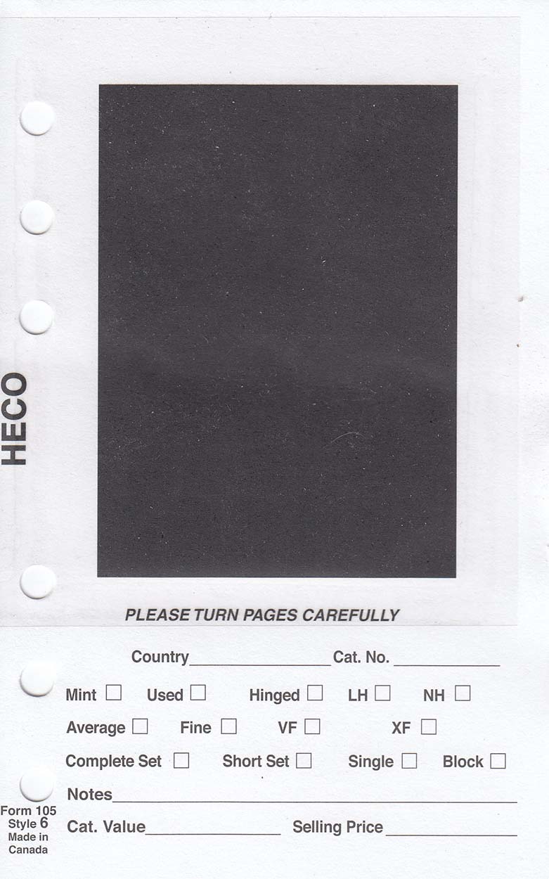 HECO Dealer Sales Pages are made with clear windows that stays firmly affixed to the page. This model features a half size window on a black background. Below the window is an area for noting country, catalog number, condition, catalog price, dealer price and other information. Sold in boxes of 500 pages.