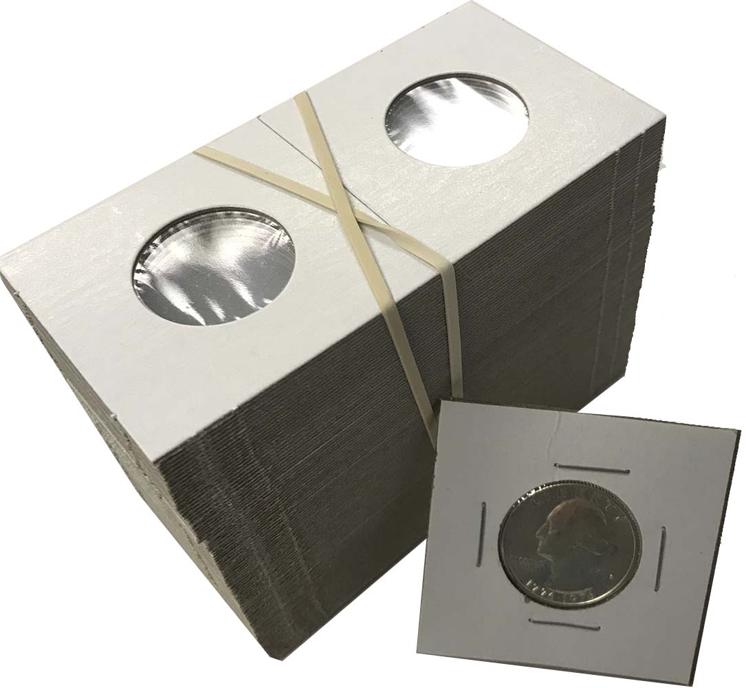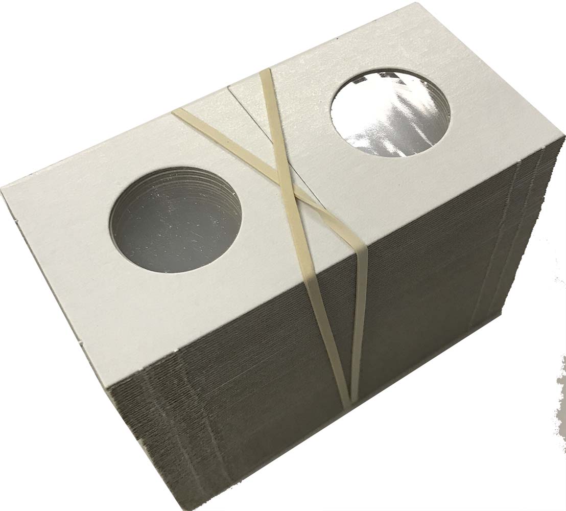 Cardboard 2x2 flips are the most widely used coin holders in the industry. Just insert a coin, fold over and staple. HECO brand holders are made with thinner cardboard than Cowen's brand holders (which we also sell). Some collectors and dealers prefer the thinner holders as more will fit in a box. The inside of HECO holders are lined with Mylar, the chemically most non-reactive lining available for coins. Mylar does not tear or scratch and is also the most moisture resistant film available. Mylar film is also dustproof with the lowest available permeability. Sold in bundles of 100 or cases of 5000 (50 bundles).