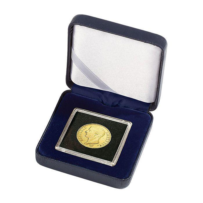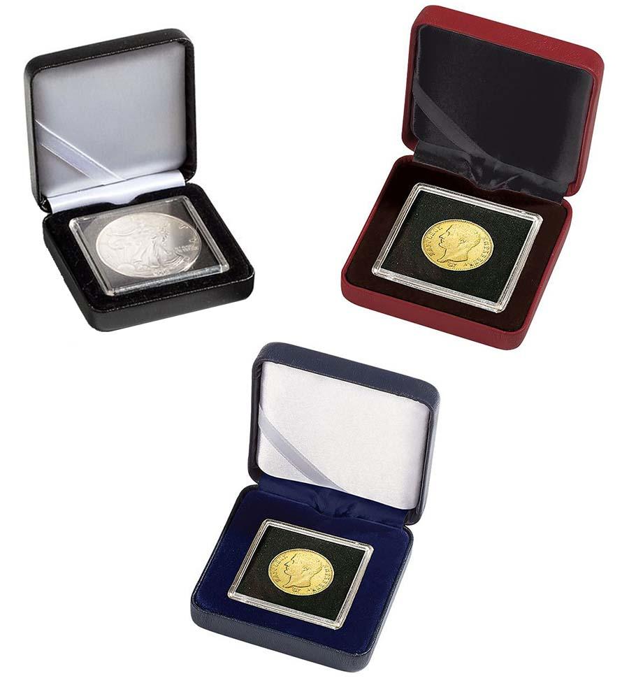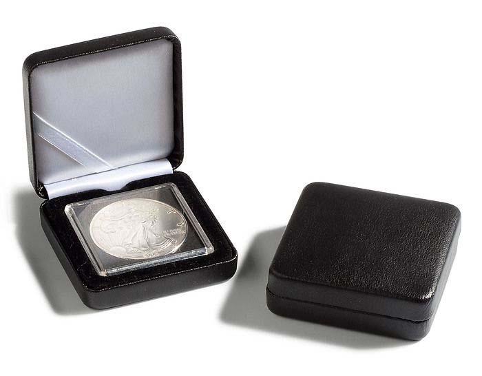 These affordable Nobile coin display boxes from Lighthouse were designed for storage and display of Lighthouse Quadrum coin holders. The exterior of these boxes is a sturdy metal frame covered with durable matt black simulated leather. The interior features a white satin lined lid and a black velvet inlay to hold your snaplock holders securely in place. They come in seven different sizes to display from one to six or 20 coins.