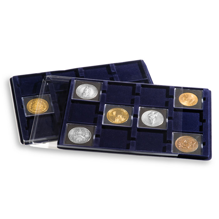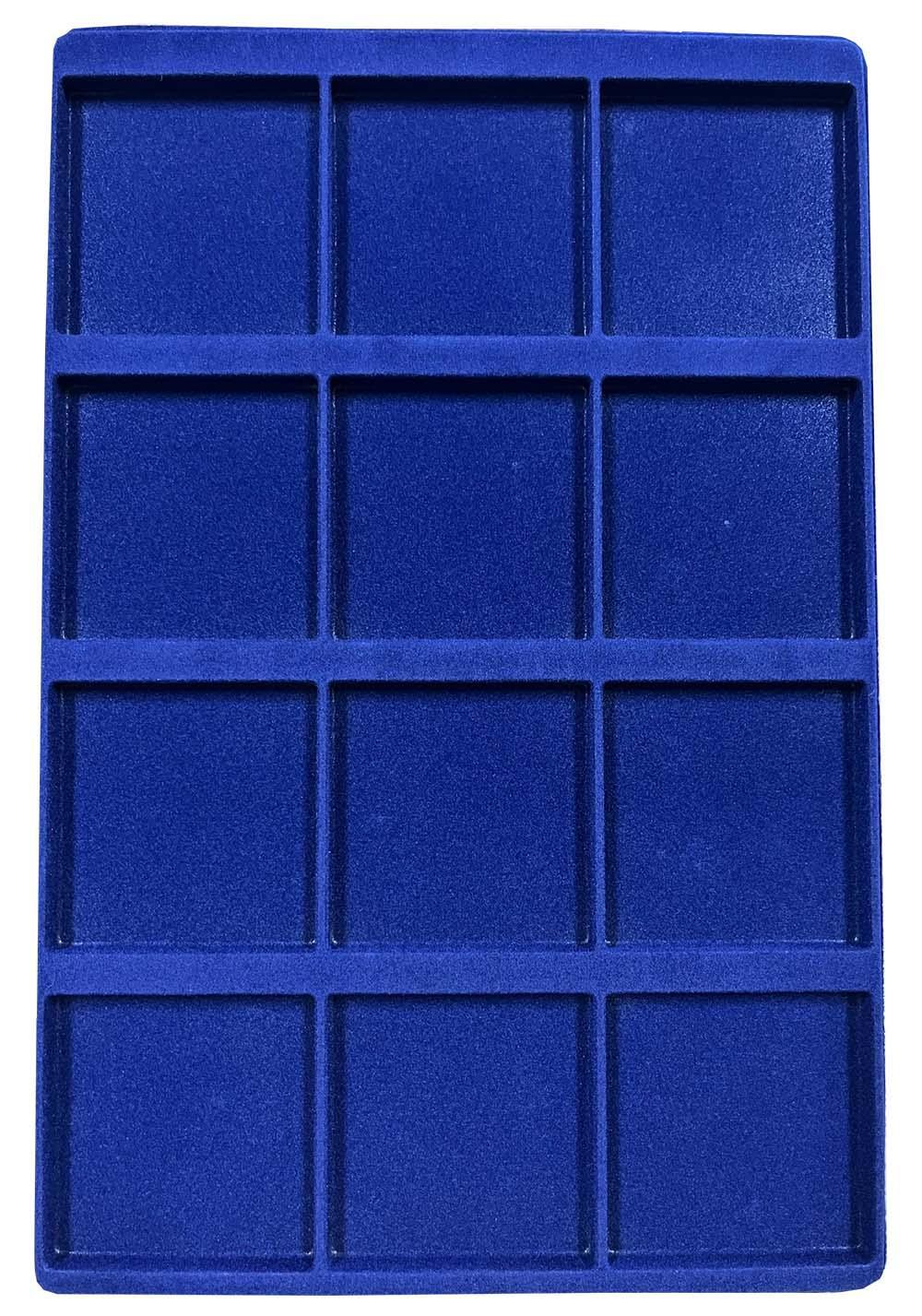 These trays are made especially for 2.5x2.5 cardboard coin holders and each tray has 12 slots. The rigid plastic tray with blue velour finish can be used as a tray independently or in combination with: