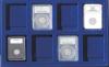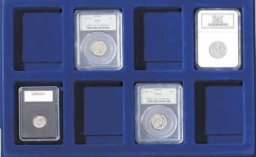 These trays are made especially for PCGS/NGC-sized slabbed coins and each tray has 8 slots. The rigid plastic tray with blue velour finish can be used as a tray independently or in combination with: