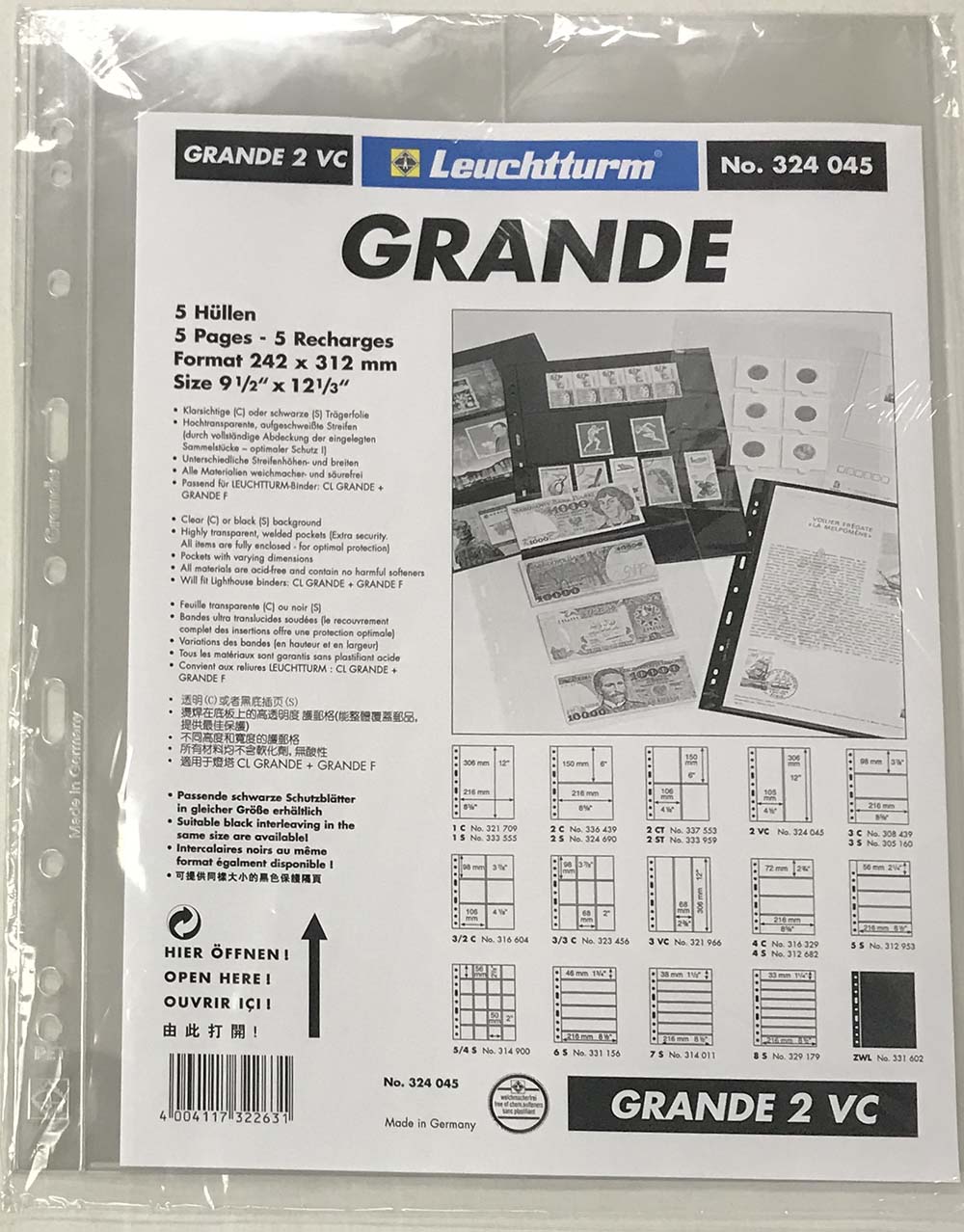 Clear archival quality polyester mylar pages for strips of stamps or #10 first day covers. On these clear Lighthouse Grande pages aboth sides of the contents are visible. Sold in packs of 5 pages.