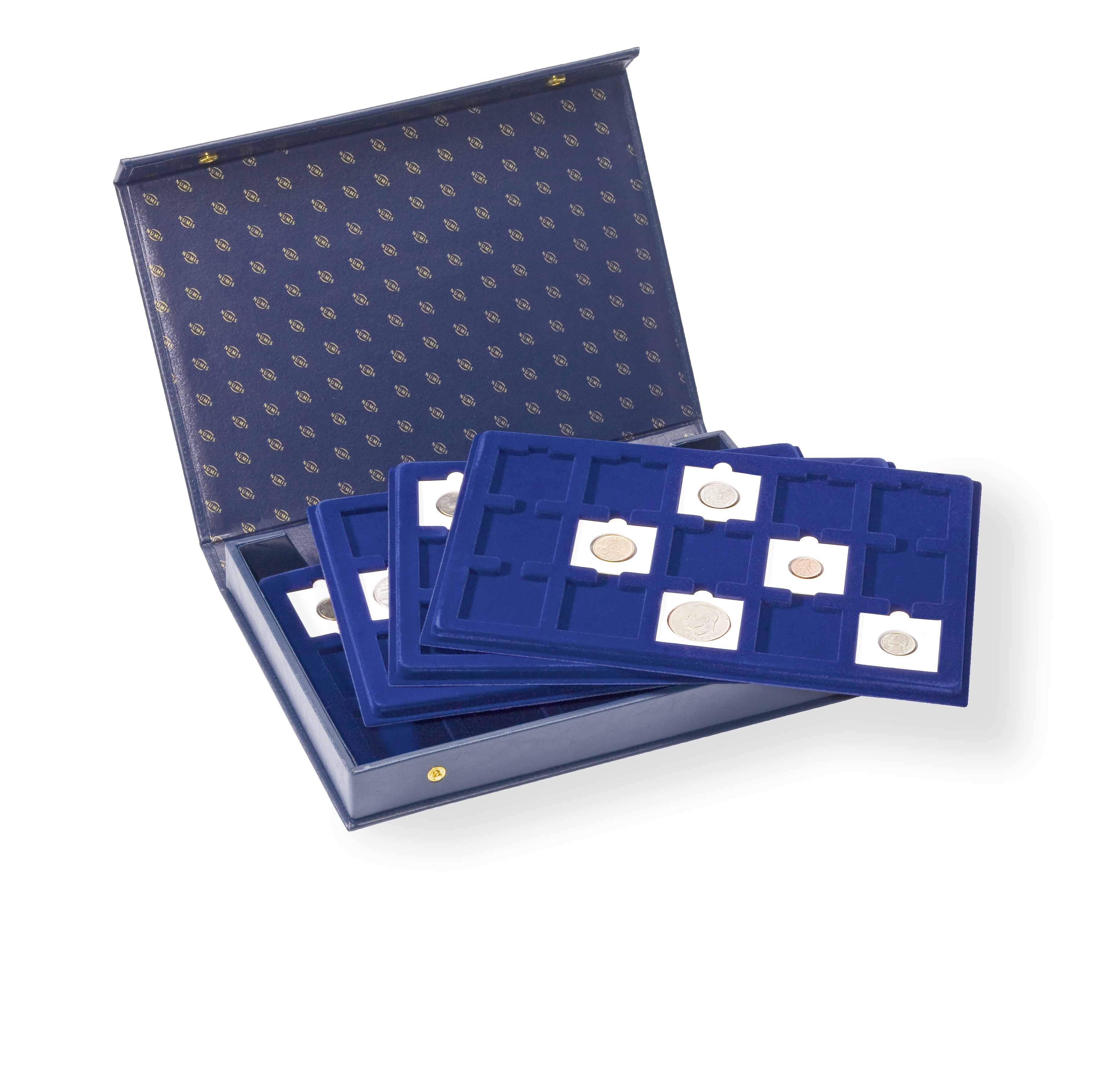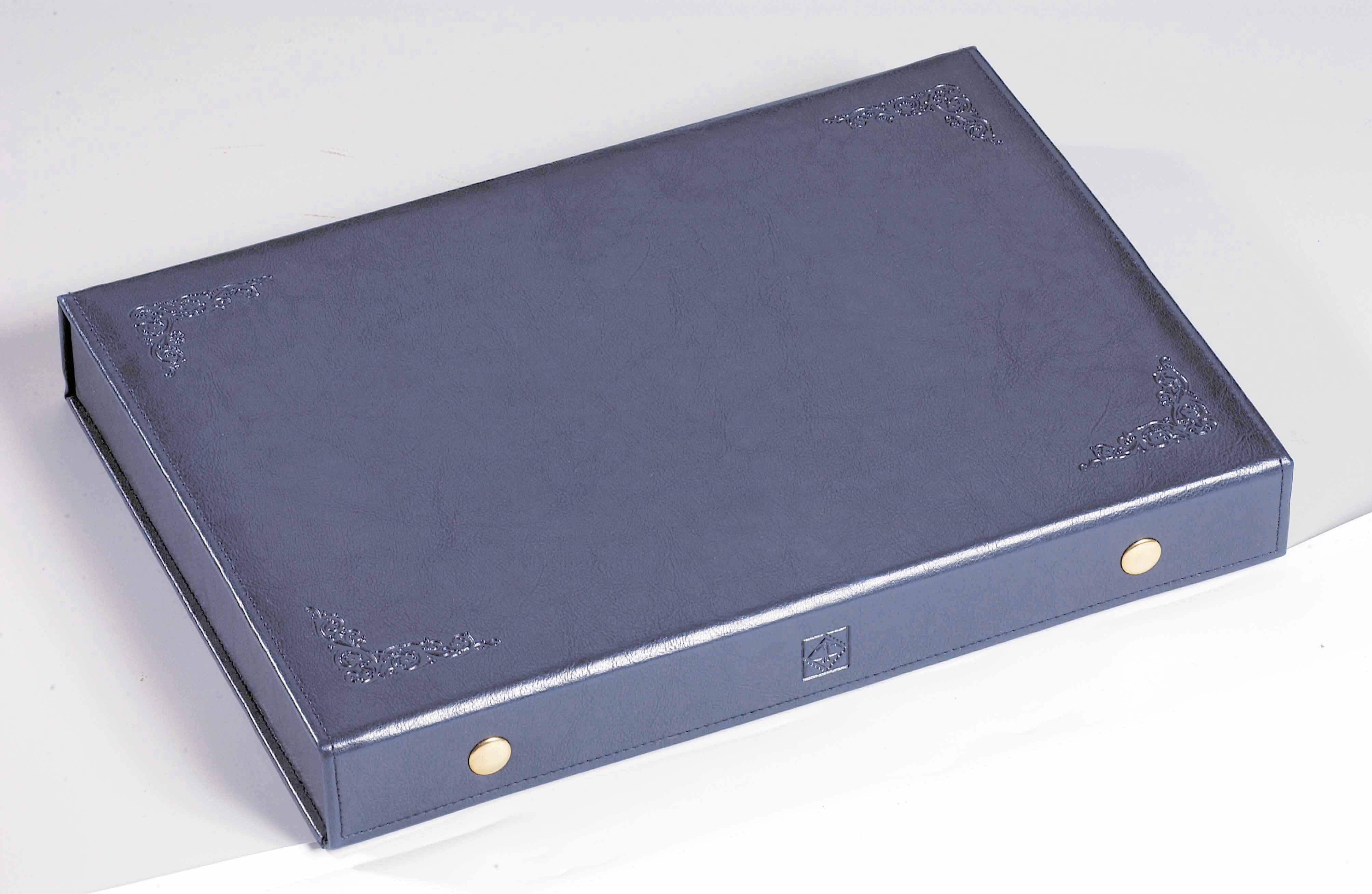 Dark blue carrying case with decorative embossing on lid and double snap button closure. Holds up to 16 slabs in two Lighthouse TAB8USKBL Trays, up to 60 2x2 holders in four Lighthouse TAB15BL Trays or up to 48 2.5x2.5 holders in four Lighthouse TABQ67BL Trays.
