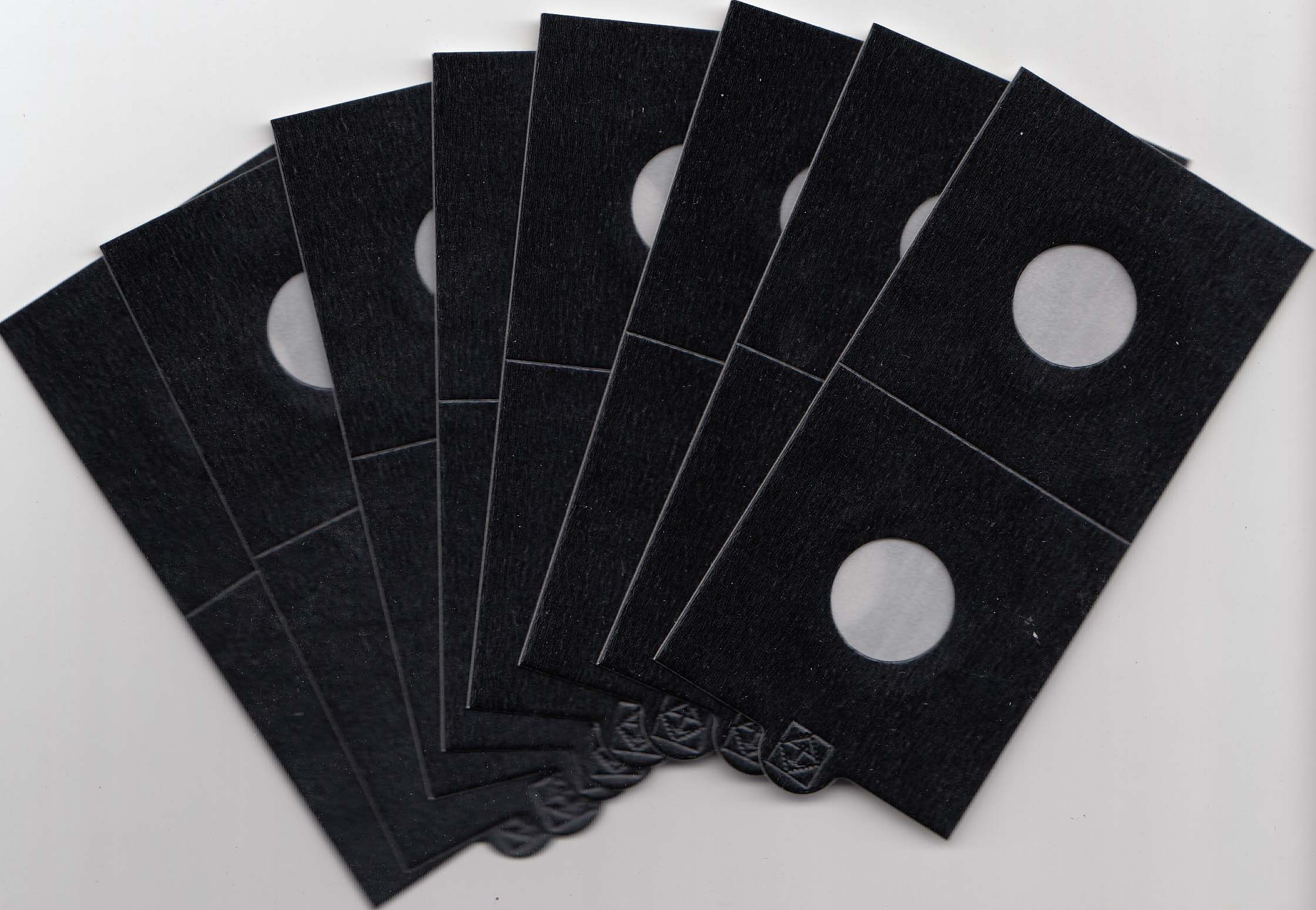Lighthouse Matrix Self Adhesive 2x2 cardboard coin holders, long popular in white cardboard, are now available in black cardboard as well so that you can choose the contrasting background that looks best for your coins. Lighthouse Matrix Self Adhesive 2x2 cardboard coin holders protect your coins from direct handling. No stapling required! Just pull away the paper exposing the adhesive, insert a coin and close to seal. The clear liners are free of chemical softeners for optimal protection and allow visibility to both sides of your coins. The outer black cardboard frame is writable for better identification (use our Metallic Sharpies for best results) and have a hermetic catch. Sold in packs of 25 pieces.