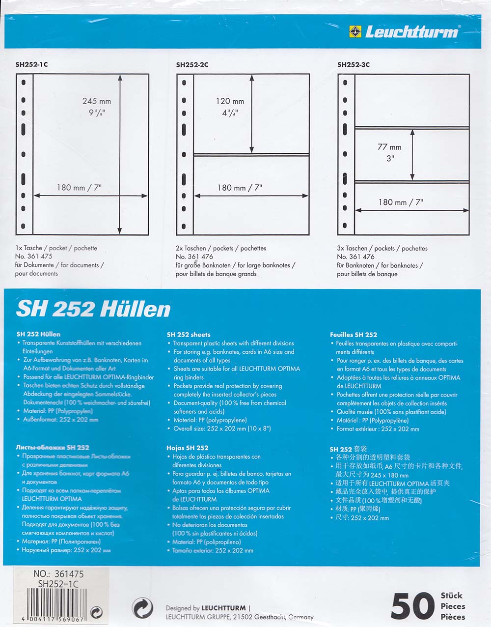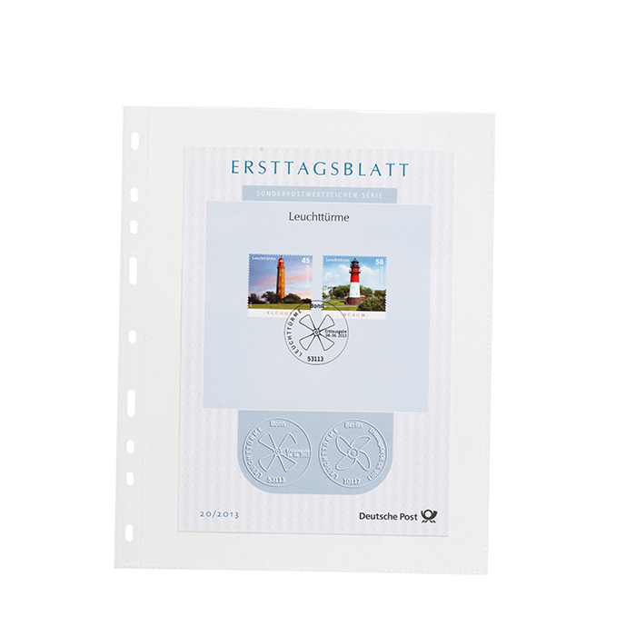 The Lighthouse Optima Easy one-pocket pages, made from clear polypropylene, are ideal for storing banknotes, postcards, covers and all different types of documents up to 9 5/8 x 7 inches (245 x 180 mm). The sheets fit all Lighthouse Optima ring binders. The pocket provides complete protection as they fully cover the collectibles stored in them. Archival quality (100% acid-free and free from plasticizers).