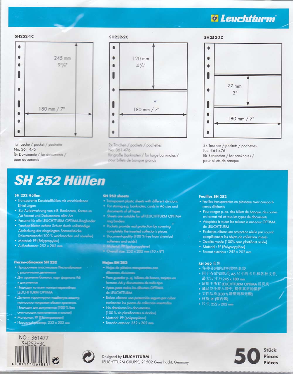 The Lighthouse Optima Easy three-pocket pages, made from clear polypropylene, are ideal for storing banknotes, postcards, covers and all different types of documents up to 3 x 7 inches (77 x 180 mm). The sheets fit all Lighthouse Optima ring binders. The pocket provides complete protection as they fully cover the collectibles stored in them. Archival quality (100% acid-free and free from plasticizers).