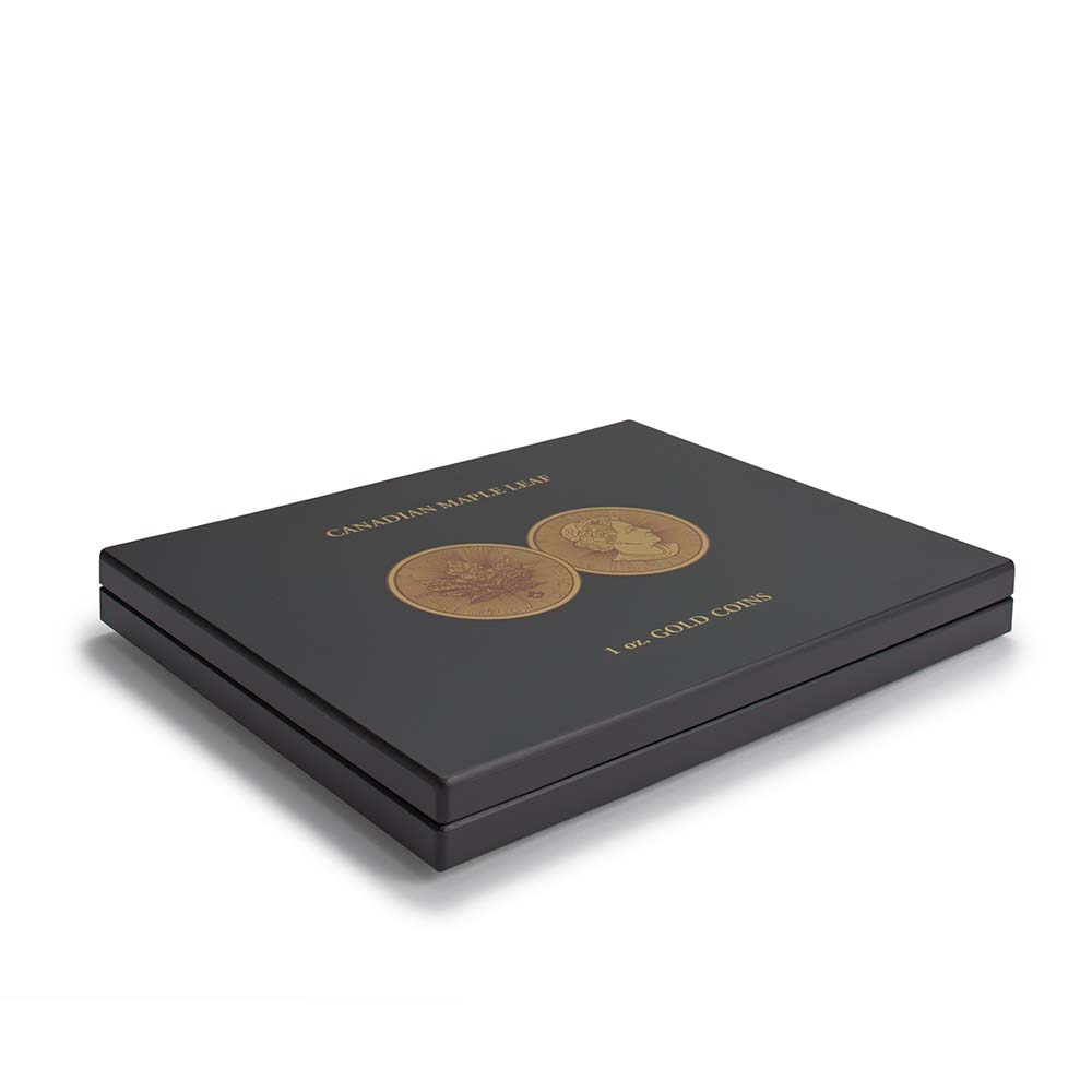 Elegant black presentation case for collecting 30 one-ounce Canadian Maple Leaf gold coins. 1 tray featuring a black velour surface and 30 round cavities designed to fit Lighthouse Capsules -- 30mm (sold separately/not included). Noble gold-colored printing on lid and cushion with coin design. Lid cushion is upholstered in black satin. Secure and unobtrusive magnetic lock.