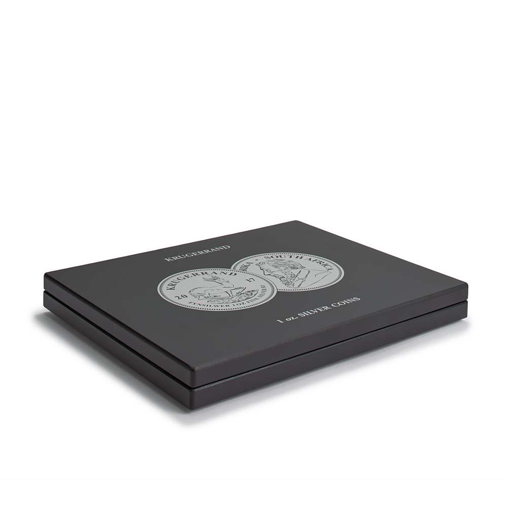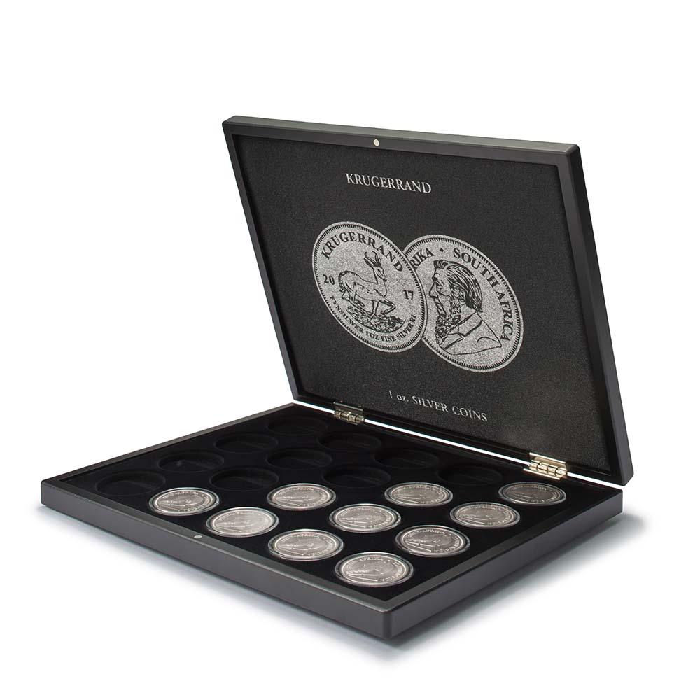 Elegant black presentation case for collecting 20 one-ounce Krugerrand silver coins. 1 tray featuring a black velour surface and 20 round cavities (1 ¾ inch (45mm) diameter) designed to fit Lighthouse Capsules -- 39mm (sold separately/not included). Silver-colored printing on lid and cushion with coin design. Lid cushion is upholstered in black satin. Secure and unobtrusive magnetic lock.
