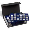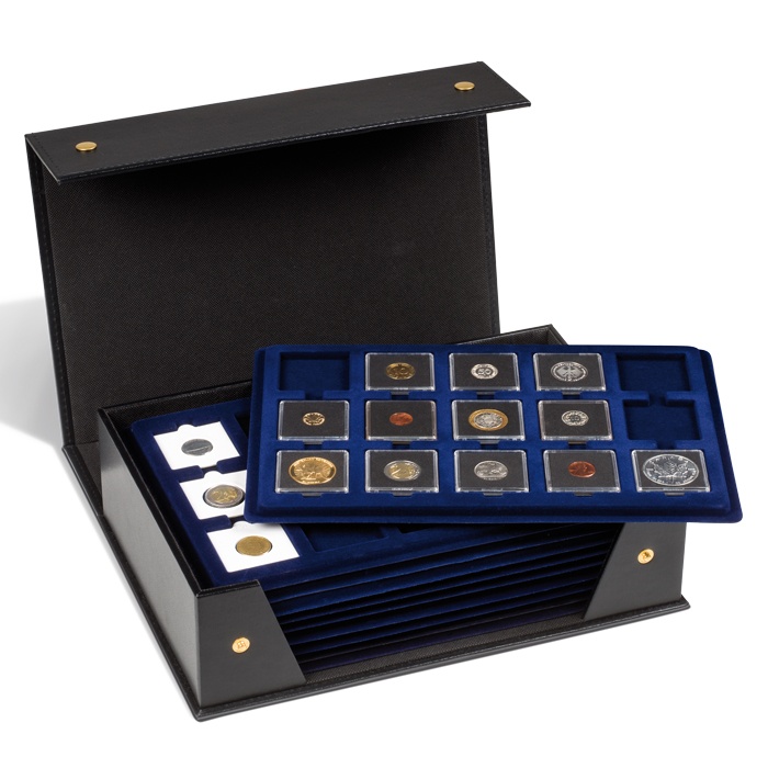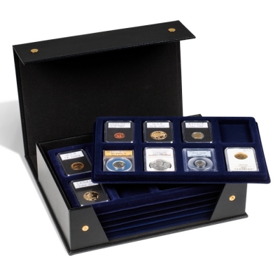 This elegant coin box is made of padded black leatherette with a gold plated double push button closure. The tri-fold lid can be opened and placed flat to create a practical presentation area. The wide V-shaped opening at the front makes it easy to insert and remove trays. This box can hold up to 48 slabs in six Lighthouse TAB8USKBL Trays, up to 150 2x2 holders in ten Lighthouse TAB15BL Trays or up to 120 2.5x2.5 holders in ten Lighthouse TABQ67BL Trays. Buy the box separately can customize with your own mix or match of trays (also available separately) or save when you buy the box bundled with 6 slab, 10 2x2 trays or 10 trays with 45mm x 45mm slots that are ideal for large dollars or American Silver Eagles in capsules.