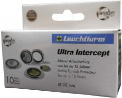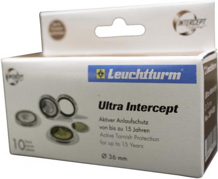 Ultra Intercept are the world's only round coin capsule offering the added benefit of active tarnish protection. The patented Intercept Technology material is applied to a chemically inert EVA foam ring and combined with an ultra-clear rimless capsule. Regular capsules limit a coin's exposure to ambient air and moisture. The highly porous, copper-based Intercept Technology material does even more: it locks in corrosive gases and provides active protection from tarnishing for up to 15 years, significantly longer in favorable storage conditions, such as cool and dry areas without extreme changes in temperature and humidity.