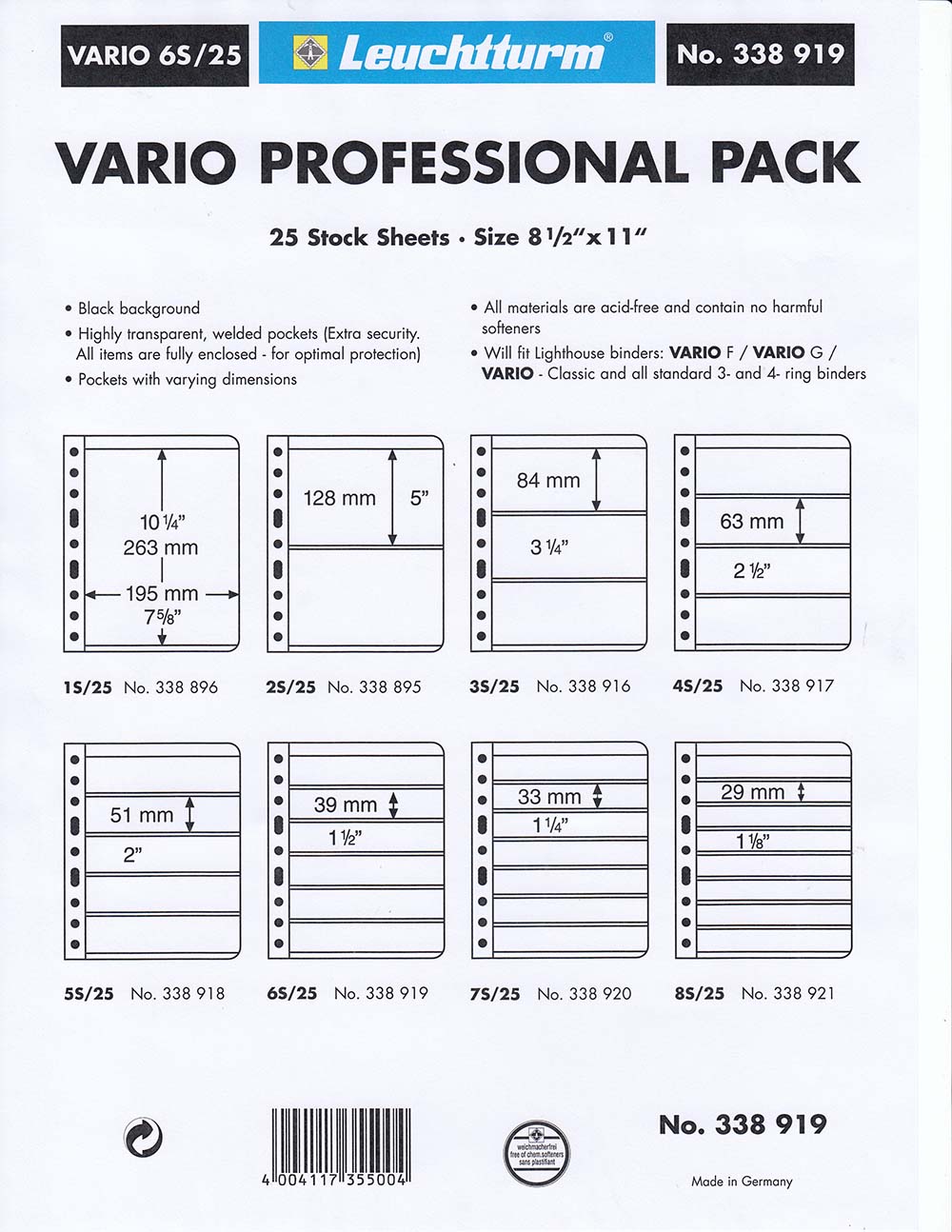 Lighthouse Vario sheets are the most versatile system available with 18 different variations of pages. They fit a wide variety of collectibles including paper money/banknotes from any country, stamps, souvenir sheets, booklets, coil stamps, first day covers, postcards, phone cards, hotel room key cards, casino slot cards and many more similar collectibles. Black Vario pages are made of unplasticized PVC without acids or chemical softeners. They come with crystal clear pockets or strips on both sides of the page for twice the capacity. Clear Vario pages are made of archival polyester and are also 100% acid-free and chemical softener-free. Originally developed for stamp collections, they have been chosen by experienced collectors all over the world time and again. Lighthouse Vario pages are made to fit Lighthouse Vario Binders and work best when used with Lighthouse Vario Binders. However, Lighthouse Vario pages will also fit these other binders sold by Wizard: