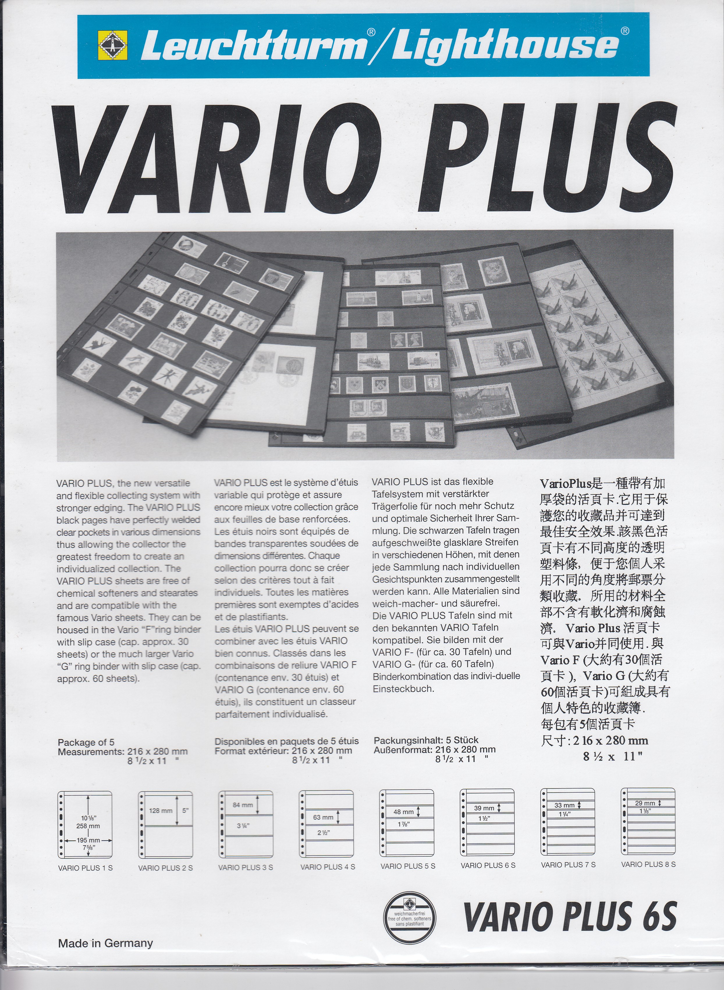 Lighthouse Vario Plus sheets are stronger and stiffer than regular Vario sheets. The are compatible (and same dimensions) as regular Vario sheets so can be used interchangeably with them. Lighthouse Vario PLus pages are made to fit Lighthouse Vario Binders and work best when used with Lighthouse Vario Binders. However, Lighthouse Vario pages will also fit these other binders sold by Wizard: