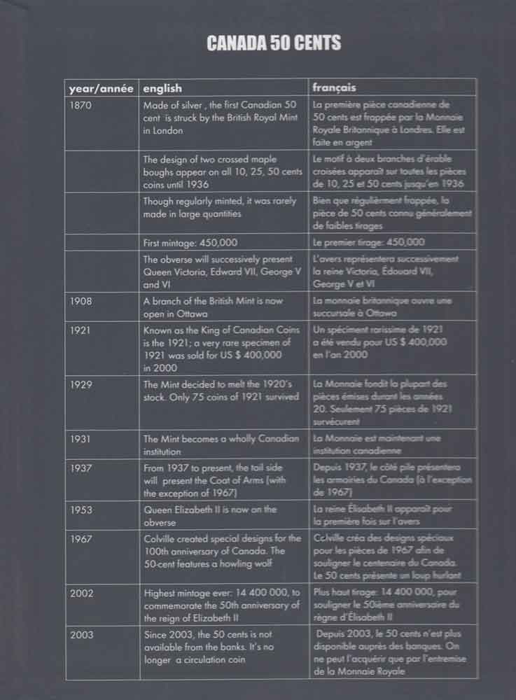 Lighthouse Vista Book Coin Albums have a laminated cover featuring stunning images of Canadian nature. The popular VISTA storage system with clear sliding inserts (free from acids and chemical softeners) is safe and easy to use. Includes many interesting coin facts and mintage information on the inside covers. This album covers Canadian Half Dollars from 1870 to 1952. To add additional capacity, use Lighthouse Vista Book Canada Blank Page -- Silver 50 Cent. Other matching albums are available for a wide range of Canadian circulation coin series.