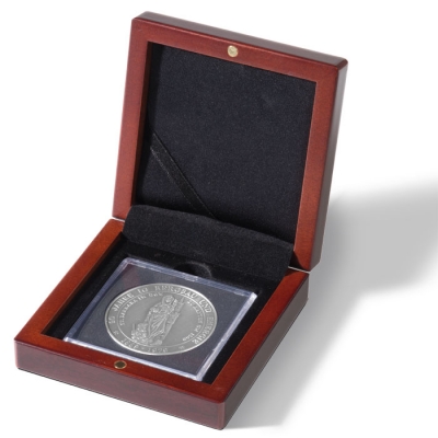 The most elegant way to present an individual coin in a large Quadrum XL snaplock. Case in mahogany wood grain finish with black satin lining and certificate ribbon, black velour insert, gold-plated hinges, and secure magnetic closure define this elegant presentation box.