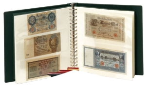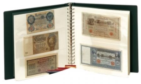 This banknote album is the preferred album among banknote collectors and comes with a deluxe matching slipcase and 20 Lindner Currency Pages. There are 10 two pocket pages for large banknotes and 10 three pocket pages for small bank notes. Choose from five available colors. Additional Lindner Currency Pages are available separately. are sold separately.