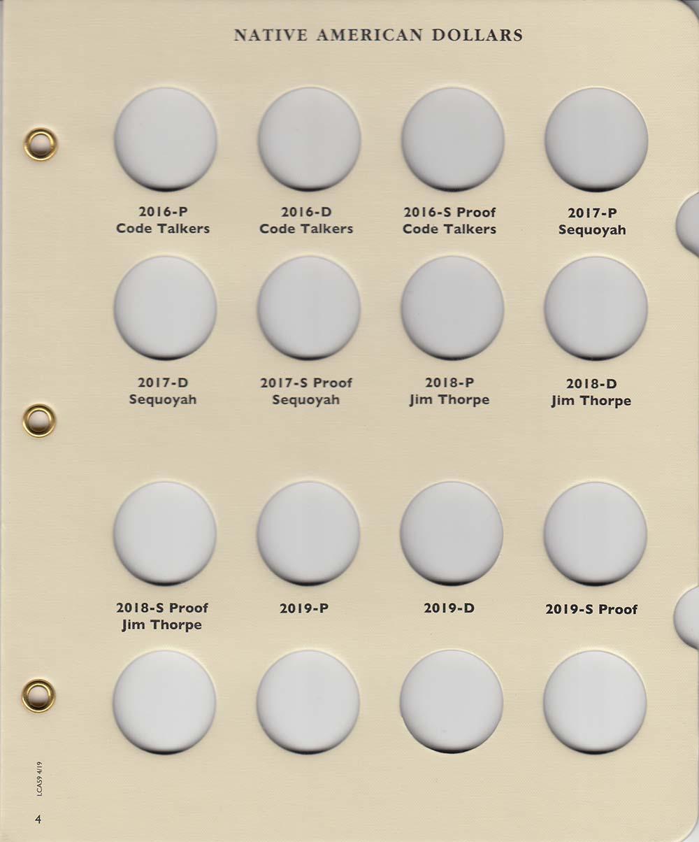 Bring your Littleton LCA59 Sacagawea Dollar Album up to date with this archival-quality page that covers 2016-P through 2019-S with an additional four unlabeled holes.
