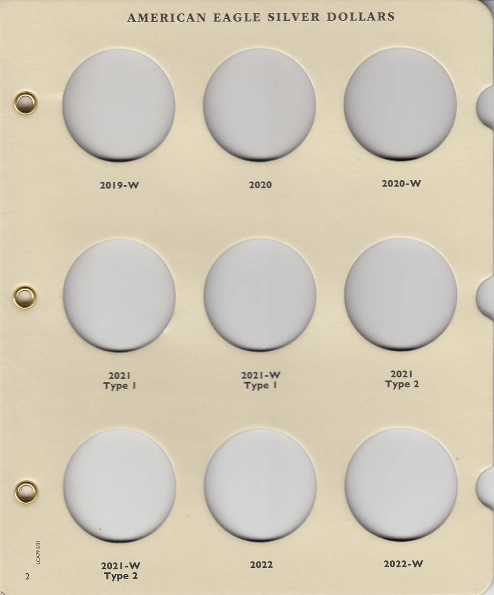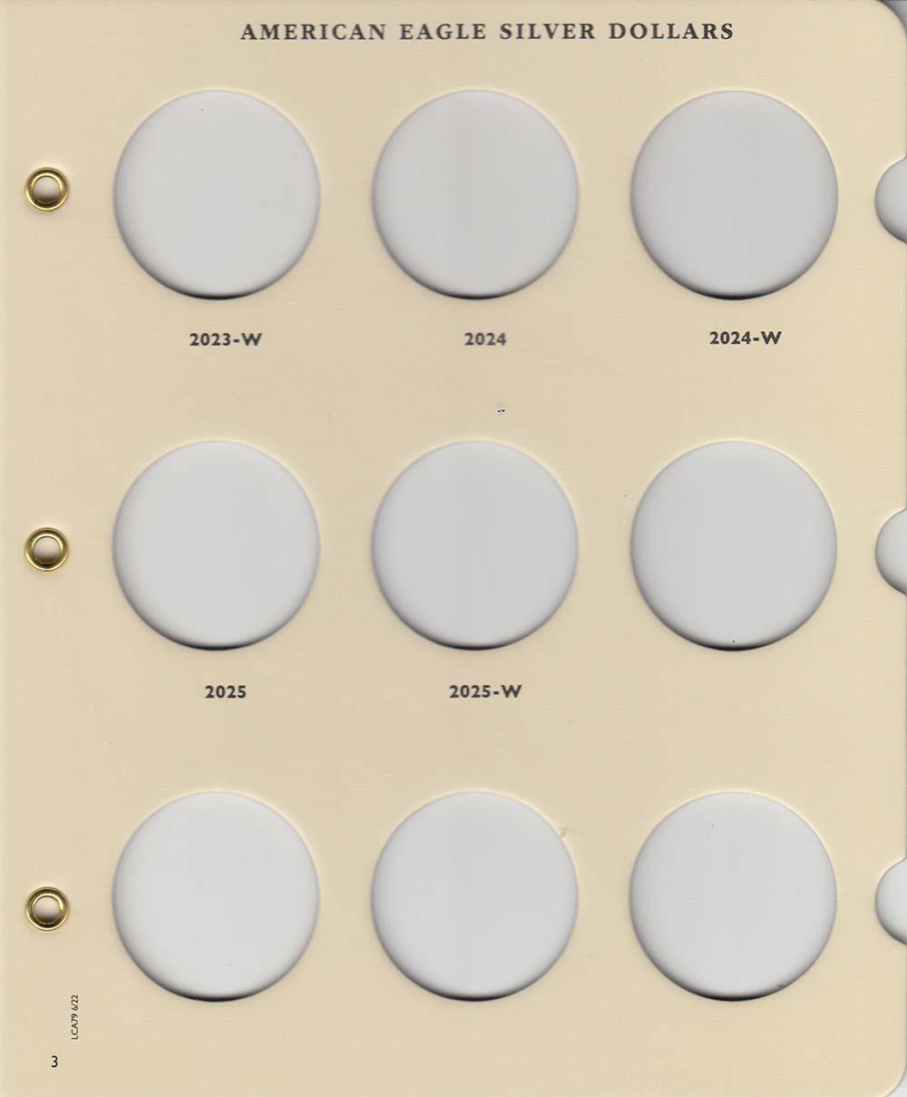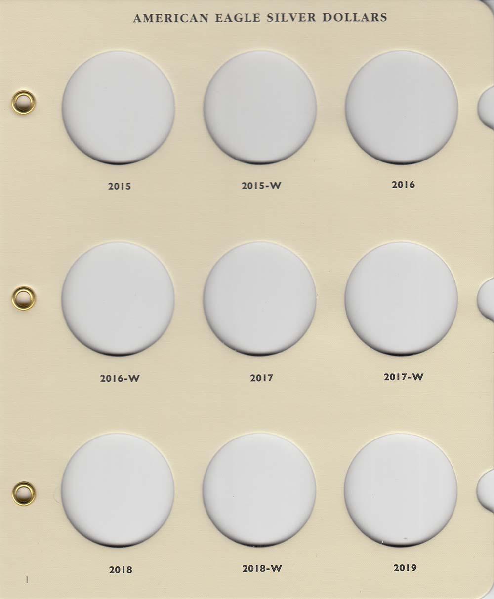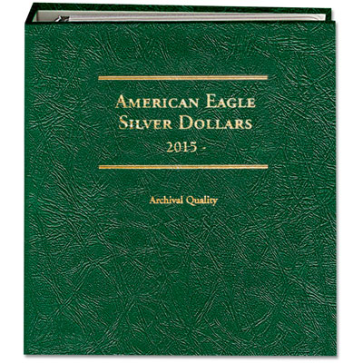 This album includes spaces for one Silver Eagle for each year starting with 2015. Littleton albums provide archival-quality, acid-free, and PVC-free long-term storage for your collection. Each album gives you a brief history about the series, along with mintage figures. Littleton albums feature sturdy 3-ring binder construction, so album pages lie flat and can be easily removed. Brass eyelets reinforce the pages, and thumb-holds make slide removal convenient. Crystal-clear slides show both obverse and reverse. Album fits in a 1.5-inch slipcase (sold separately).