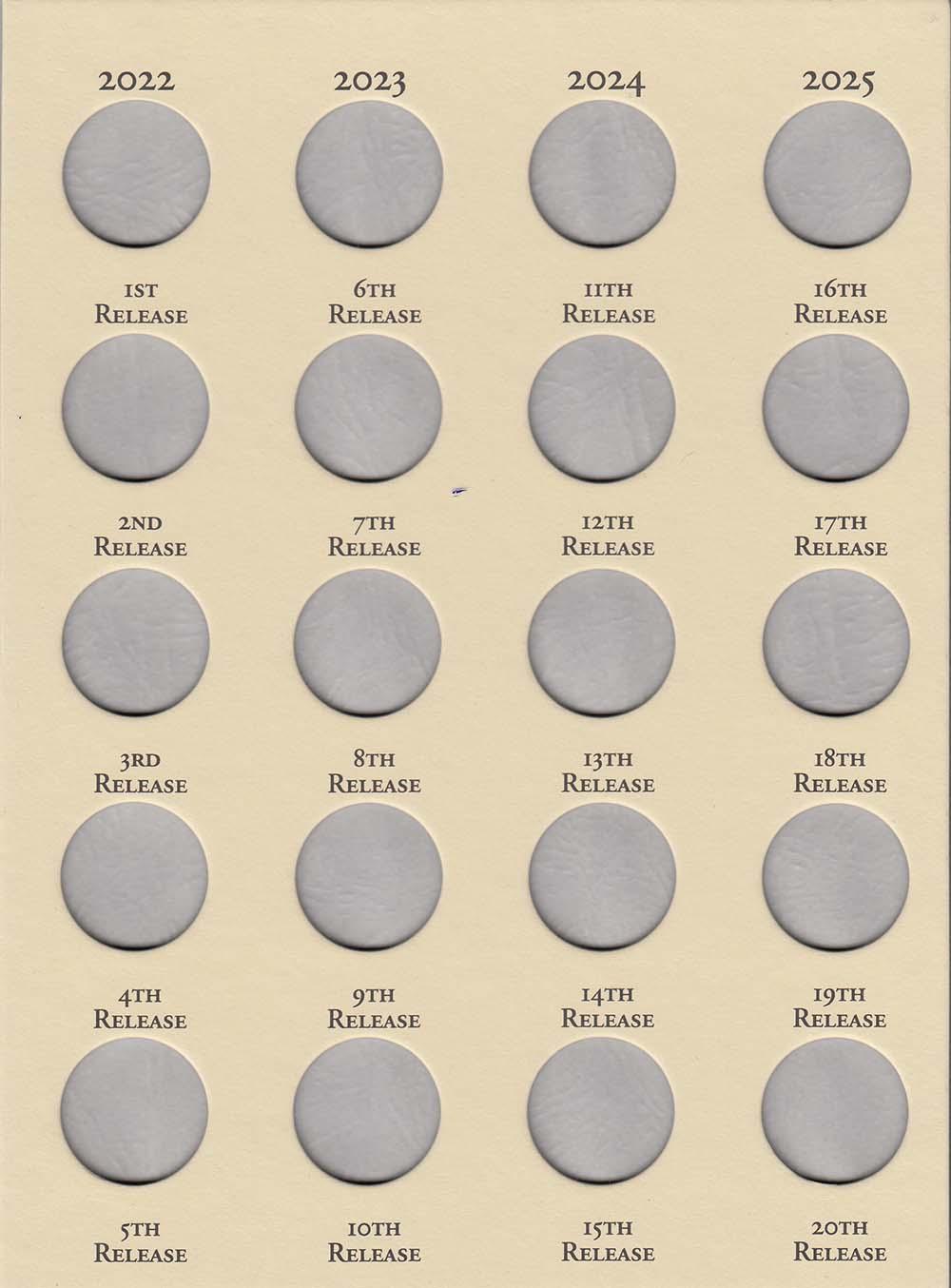Littleton folders are handsome and durable. They hold your coins securely and are 6 1/2" x 8 3/8" to easily fit on your bookshelf. Green leather-look with gold embossing on exterior. This folder has 20 slots to hold a quarter for each of the American Women Quarters issued from 2022 to 2025.