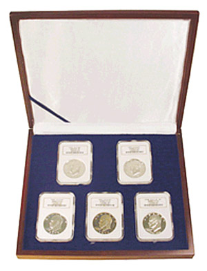 A deep mahogany color display box that is ideal for displaying PCGS/NGC-size certified coins. The box has a hinged lid and also makes a nice gift boxes for certified coins. Holds five PCGS/NGC-size certified coins.