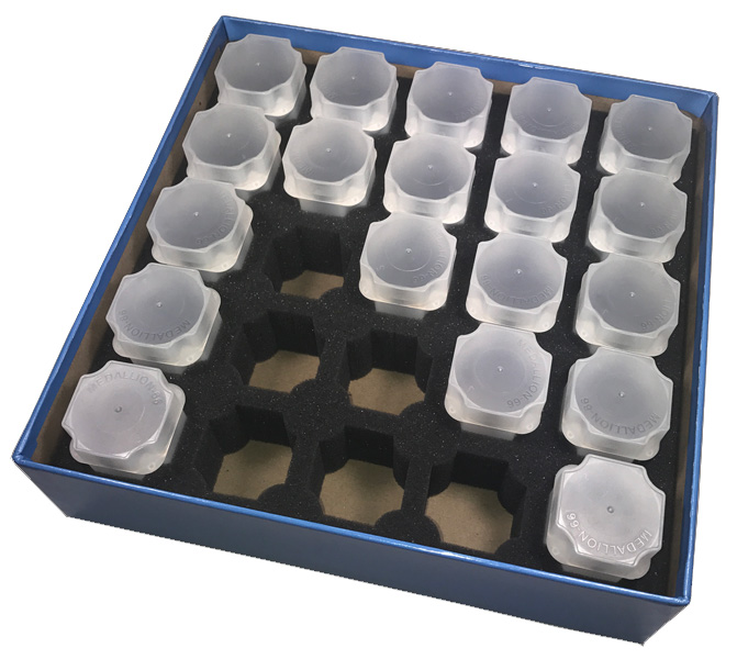 Guardhouse heavy-duty coin tube boxes for shipping Guardhouse Medallion Size Square Tubes for 1 oz rounds are designed to perfectly accommodate 500 oz of silver. Guardhouse heavy-duty coin tube boxes feature re-enforced tape filaments and internal dividers constructed of inert foam. Guardhouse coin tube boxes have a high quality exterior, are manufactured with thumb-cut notches and are ideal for shipping or storage.
