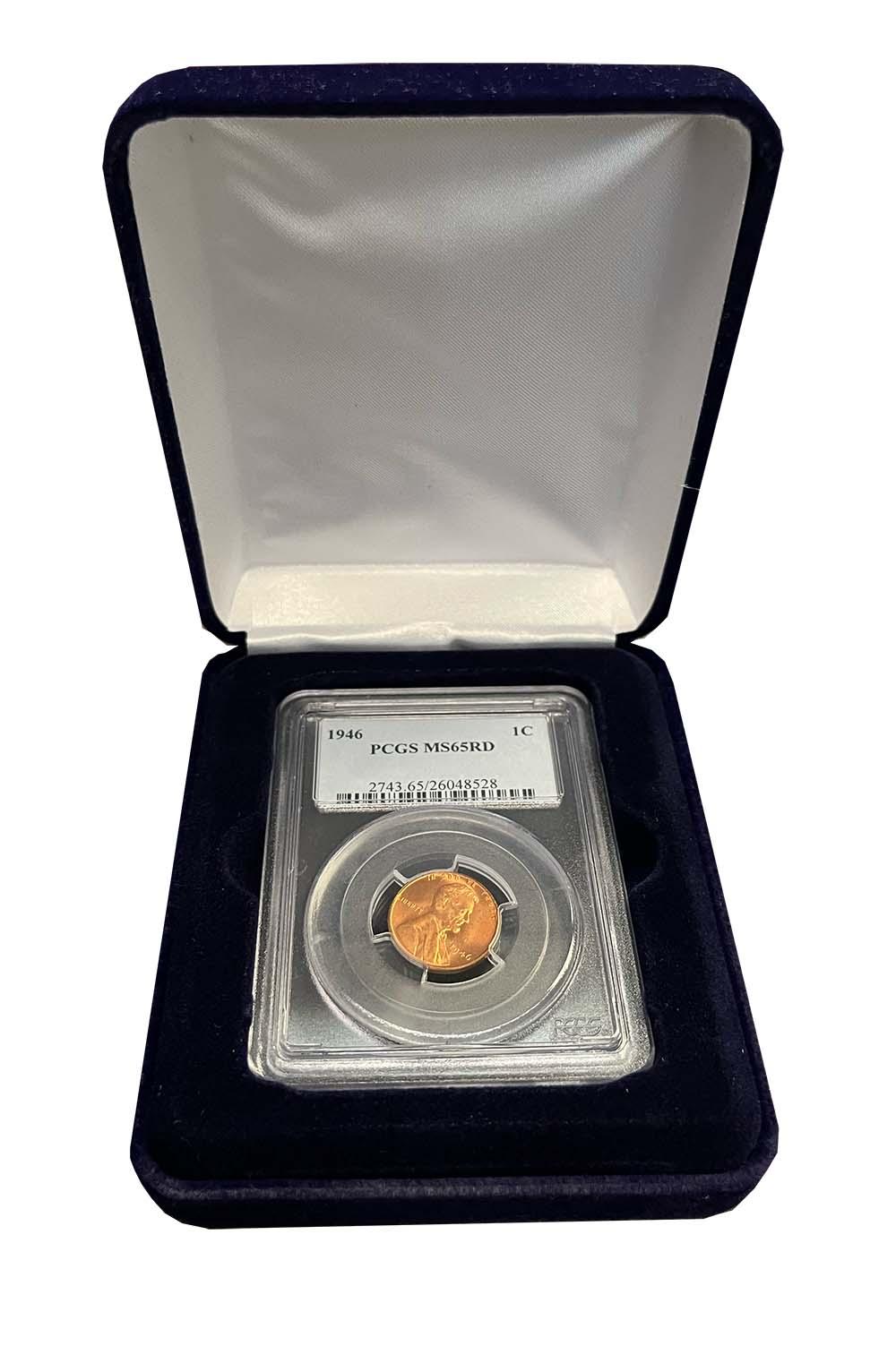 These sturdy steel clamshell style boxes are made in the USA. The metal frame is hand wrapped in blue velvet material. The included vacuum form insert tray is flocked to match the color of the exterior wrap and is designed to securely hold slabbed coins in place. The inside of the lid features a white satin die cut puff to provide a finishing touch to the box. The box will accommodate NGC and PCGS slabbed coins and a nice display or gift box for individual slabbed coins.