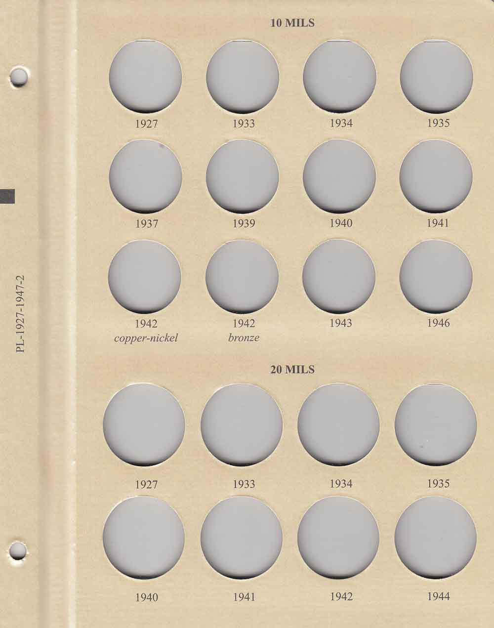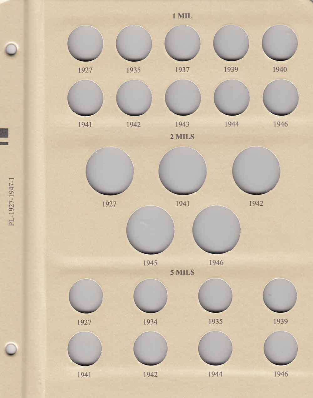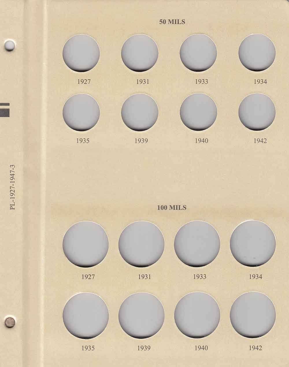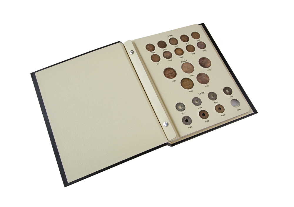 This album consists of 3 pages and contains a total of 59 slots. These slots are designed to house coins issued by Palestine between 1927 and 1947, with the correct diameters and dates for all known varieties.