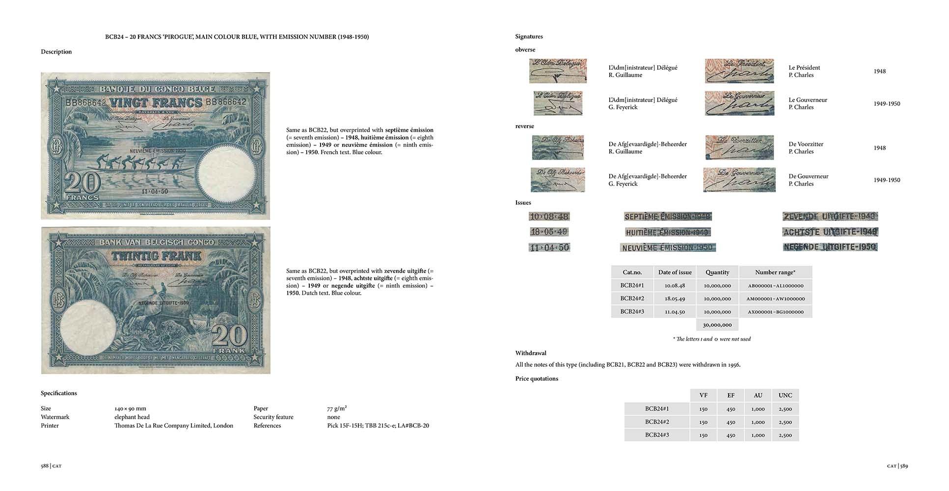 Using unpublished archival documents from at home and abroad, all projects and actual issues are discussed in detail with the exception of the banknotes issued during the Second World War, since the Bank of Belgian Congo had relocated its activities to London and Kinshasa, and documents of that period appear to have been lost during the air raids on London.