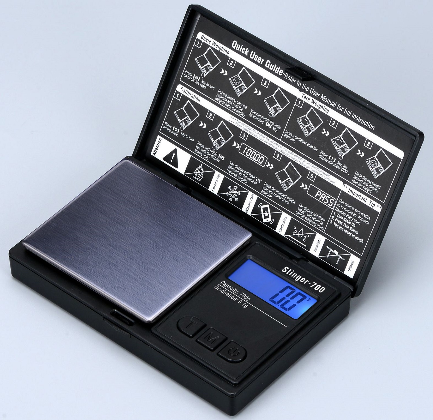The Stinger-700 features a stainless steel weighing platform and a backlit LCD display. It includes a tare function and raised buttons for simple operation. The scale has a removable lid that doubles as a weighing tray and compact mini checkbook-style design for easy portability.