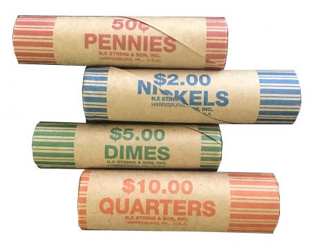 These 60lb grade kraft paper wrappers are pre-crimped on one end to keep them open and make them easy to fill, by hand or machine. Sold in bags of 100 wrappers (25 each of cent, nickel, dime and quarter sizes).