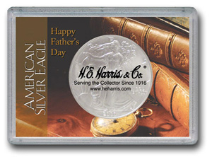 This deluxe 2x3 special occasion frosty case has one Silver Eagle sized hole. Complete your Father's Day gift by buying this attractive holder together with a Brilliant Uncirculated Silver American Eagle.