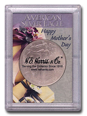 This deluxe 2x3 special occasion frosty case has one Silver Eagle sized hole. Complete your Mother's Day gift by purchasing the holder together with a Brilliant Uncirculated American Silver Eagle.