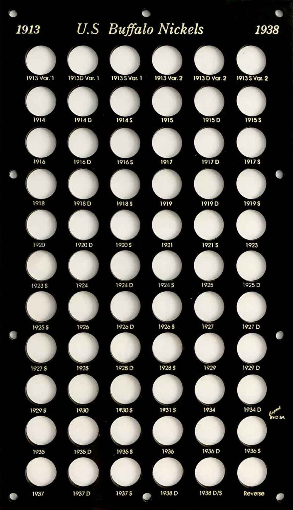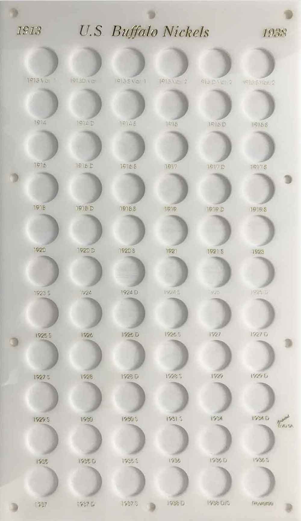 Capital Plastics offers the largest selection of premium coin holders of any available brand. This holder has 66 holes for the complete Buffalo Nickel set from 1913 to 1938-D/S. Sized to fit inside a bank vault drawer.